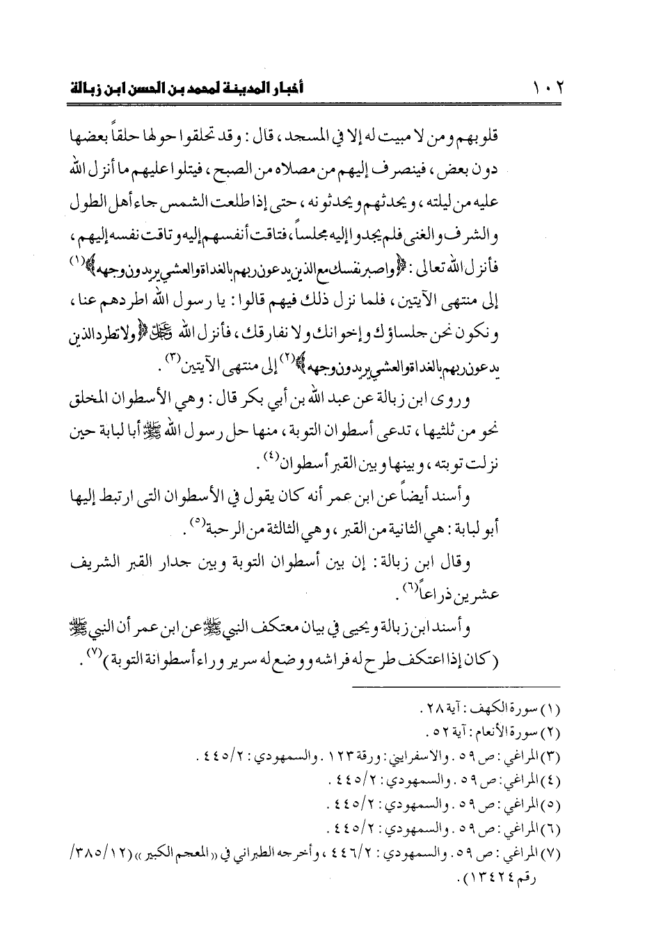 وأسند أيضاً عن ابن عمر أنه كان يقول في الأسطوان التى ارتبط إليها أبو لبابة: هي الثانية من القبر، وهي الثالثة من الرحبة (5).