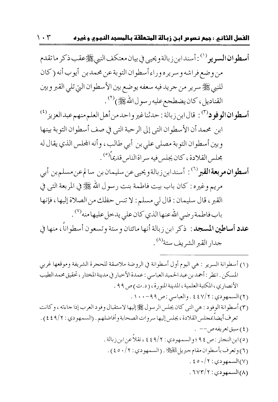 أسطوان الوفود (3): قال ابن زبالة: حدثنا غير واحد من أهل العلم منهم عبد العزيز (4) ابن محمد أن الأسطوان التى إلى الرحبة التى في صف أسطوان التوبة بينها وبين أسطوان التوبة مصلى علي بن أبي طالب، وأنه المجلس الذي يقال له مجلس القلادة، كان يجلس فيه سراة الناس قديماً (5).