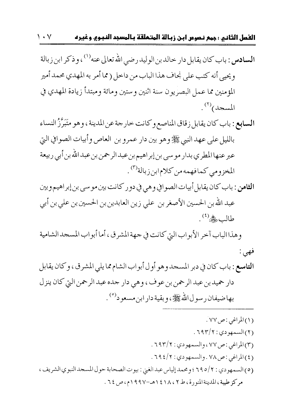 (5) السمهودي: 2/ 695؛ ومحمد إلياس عبد الغني: بيوت الصحابة حول المسجد النبوي الشريف، مركز طيبة، المدينة المنورة، ط 2، 1418هـ-1997م، ص 64.