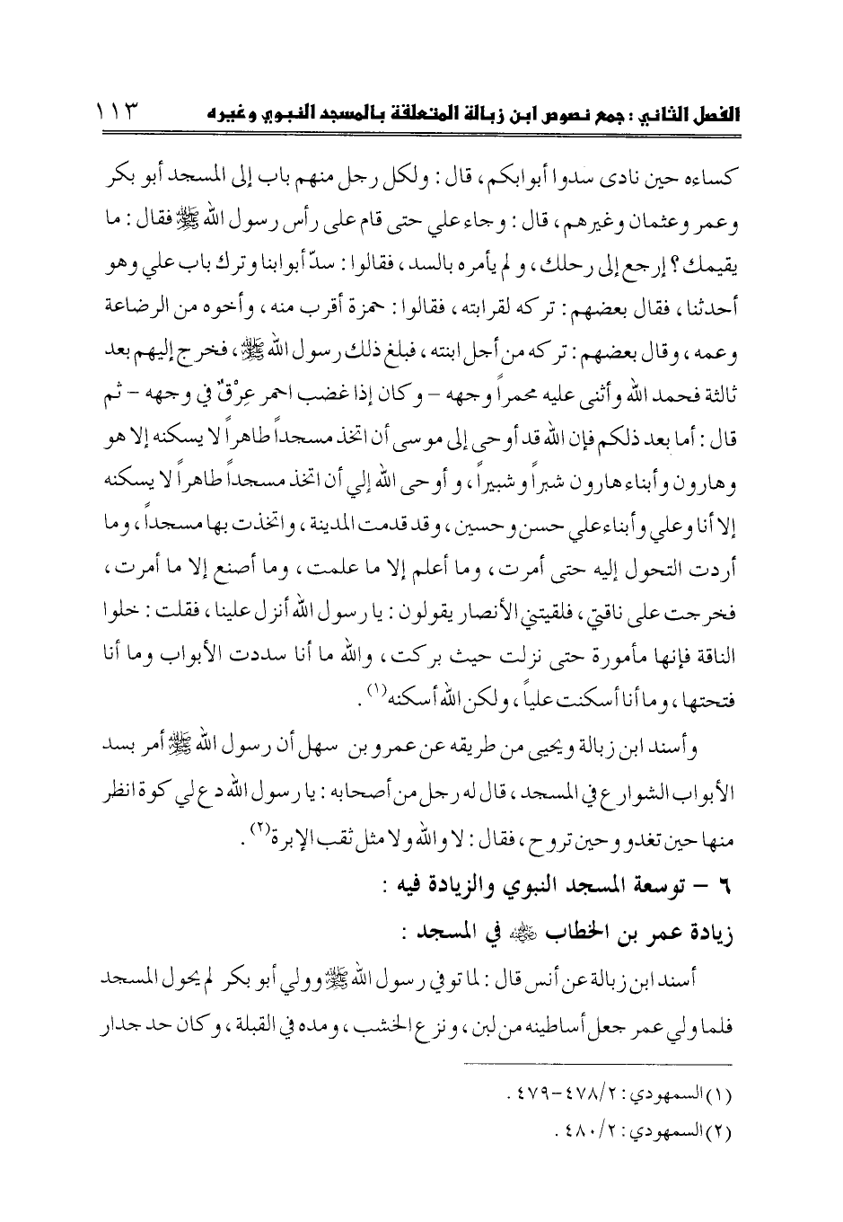 وأسند ابن زبالة ويحيى من طريقه عن عمرو بن سهل أن رسول الله صلى الله عليه وسلم أمر بسد الأبواب الشوارع في المسجد، قال له رجل من أصحابه: يا رسول الله دع لي كوة انظر منها حين تغدو وحين تروح، فقال: لا والله ولا مثل ثقب الإبرة (1).