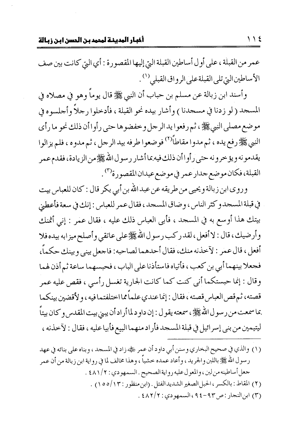 (1) والذي في صحيح البخاري وسنن أبي داود أن عمر - رضي الله عنه - زاد في المسجد، وبناه على بنائه في عهد رسول الله صلى الله عليه وسلم باللبن والجريد، وأعاد عمده خشباً، وهذا مخالف لما في رواية ابن زبالة من أن عمر جعل أساطينه من لبن، والمعول عليه رواية الصحيح. السمهودي: 2/ 481.