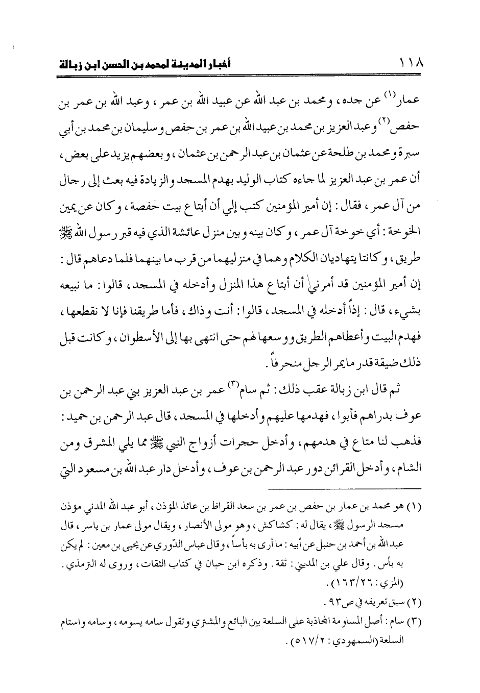 عمار (1) عن جده، ومحمد بن عبد الله عن عبيد الله بن عمر، وعبد الله بن عمر بن حفص (2) وعبد العزيز بن محمد بن عبيد الله بن عمر بن حفص وسليمان بن محمد بن أبي سبرة ومحمد بن طلحة عن عثمان بن عبد الرحمن بن عثمان، وبعضهم يزيد على بعض، أن عمر بن عبد العزيز لما جاءه كتاب الوليد بهدم المسجد والزيادة فيه بعث إلى رجال من آل عمر، فقال: إن أمير المؤمنين كتب إلي أن أبتاع بيت حفصة، وكان عن يمين الخوخة: أي خوخة آل عمر، وكان بينه وبين منزل عائشة الذي فيه قبر رسول الله صلى الله عليه وسلم طريق، وكانتا تتهاديان الكلام وهما في منزليهما من قرب ما بينهما فلما دعاهم قال: إن أمير المؤمنين قد أمرني أن أبتاع هذا المنزل وأدخله في المسجد، قالوا: ما نبيعه بشيء، قال: إذاً أدخله في المسجد، قالوا: أنت وذاك، فأما طريقنا فإنا لا نقطعها، فهدم البيت وأعطاهم الطريق ووسعها لهم حتى انتهى بها إلى الأسطوان، وكانت قبل ذلك ضيقة قدر ما يمر الرجل منحرفاً.