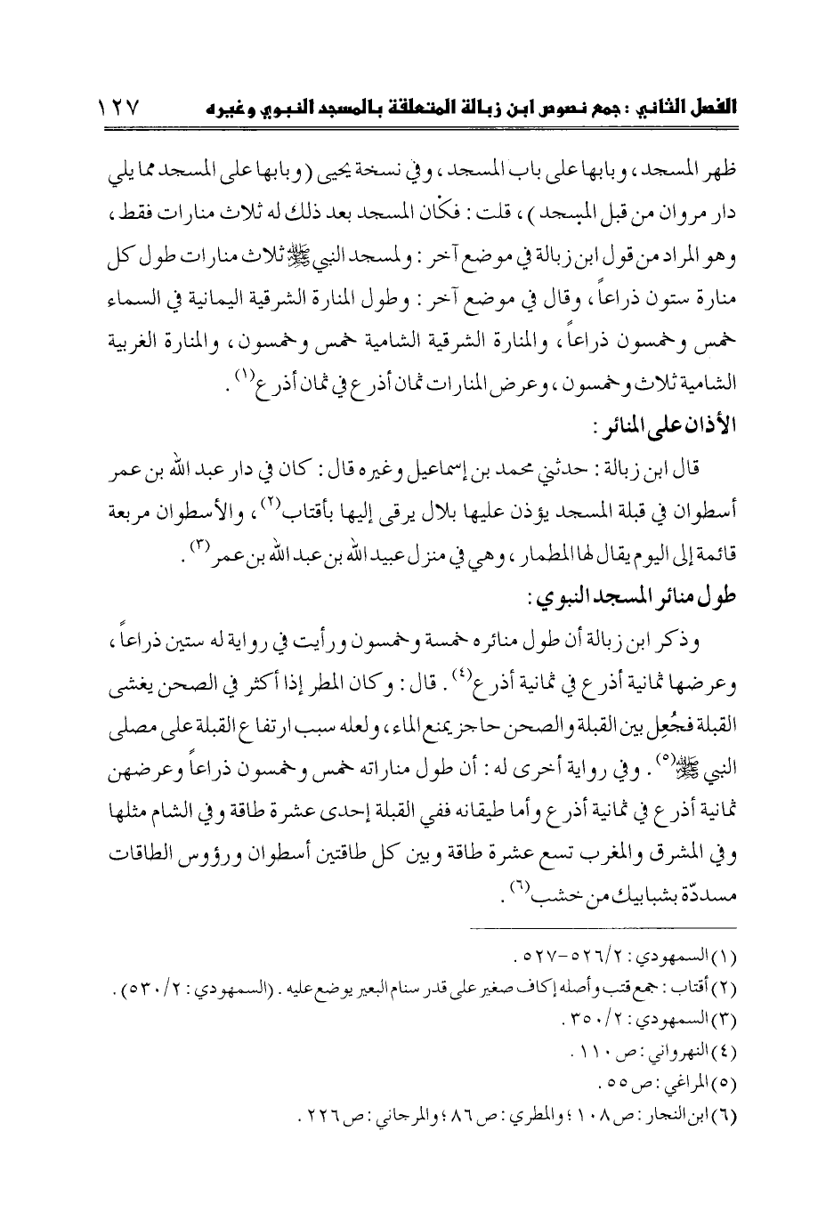ظهر المسجد، وبابها على باب المسجد، وفي نسخة يحيى (وبابها على المسجد مما يلي دار مروان من قبل المسجد)، قلت: فكان المسجد بعد ذلك له ثلاث منارات فقط، وهو المراد من قول ابن زبالة في موضع آخر: ولمسجد النبي صلى الله عليه وسلم ثلاث منارات طول كل منارة ستون ذراعاً، وقال في موضع آخر: وطول المنارة الشرقية اليمانية في السماء خمس وخمسون ذراعاً، والمنارة الشرقية الشامية خمس وخمسون، والمنارة الغربية الشامية ثلاث وخمسون، وعرض المنارات ثمان أذرع في ثمان أذرع (1).