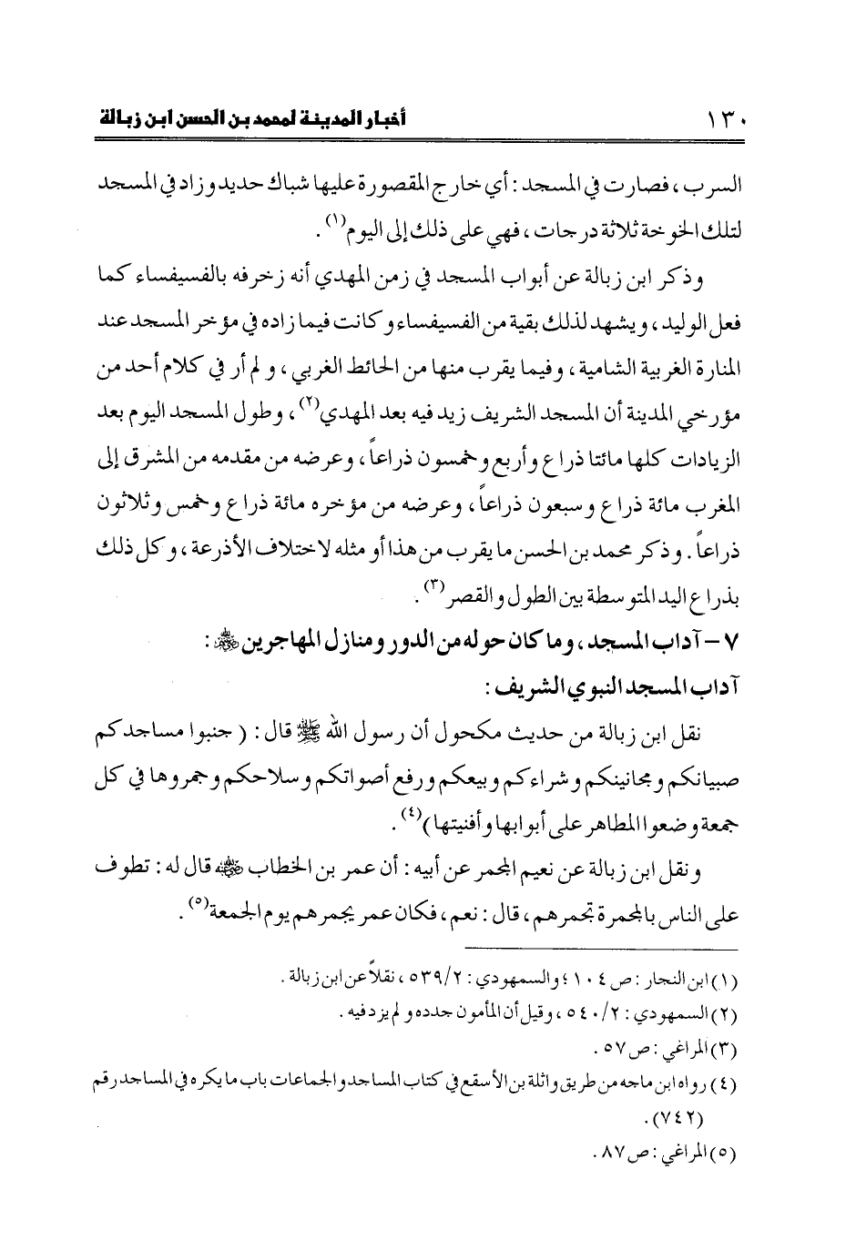 وذكر ابن زبالة عن أبواب المسجد في زمن المهدي أنه زخرفه بالفسيفساء كما فعل الوليد، ويشهد لذلك بقية من الفسيفساء وكانت فيما زاده في مؤخر المسجد عند المنارة الغربية الشامية، وفيما يقرب منها من الحائط الغربي، ولم أر في كلام أحد من مؤرخي المدينة أن المسجد الشريف زيد فيه بعد المهدي (2)، وطول المسجد اليوم بعد الزيادات كلها مائتا ذراع وأربع وخمسون ذراعاً، وعرضه من مقدمه من المشرق إلى المغرب مائة ذراع وسبعون ذراعاً، وعرضه من مؤخره مائة ذراع وخمس وثلاثون ذراعاً. وذكر محمد بن الحسن ما يقرب من هذا أو مثله لاختلاف الأذرعة، وكل ذلك بذراع اليد المتوسطة بين الطول والقصر (3).