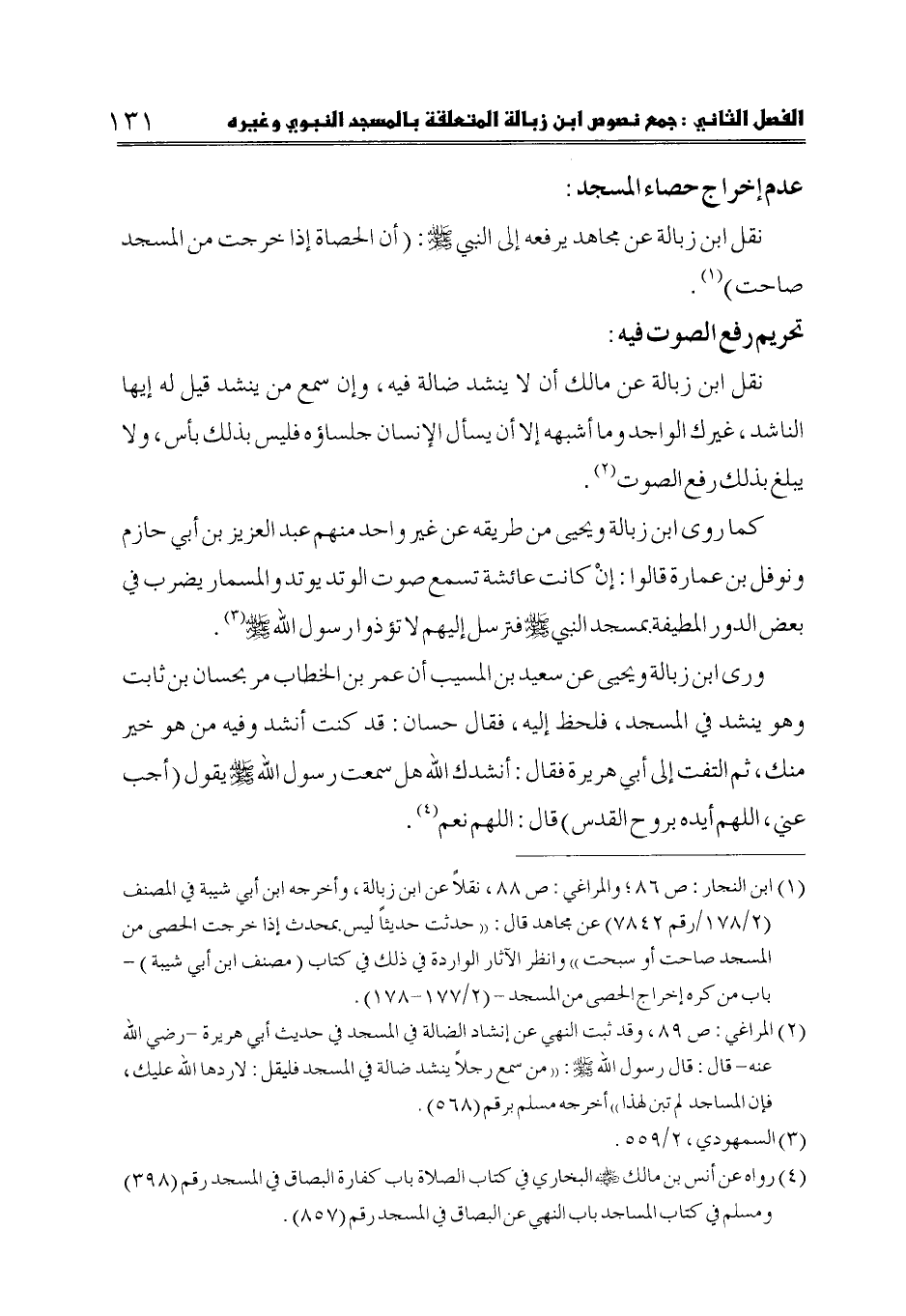(1) ابن النجار: ص 86؛ والمراغي: ص 88، نقلاً عن ابن زبالة، وأخرجه ابن أبي شيبة في المصنف (2/ 178/رقم 7842) عن مجاهد قال: ((حدثت حديثاً ليس بمحدث إذا خرجت الحصى من المسجد صاحت أو سبحت)) وانظر الآثار الواردة في ذلك في كتاب (مصنف ابن أبي شيبة) - باب من كره إخراج الحصى من المسجد - (2/ 177 - 178).