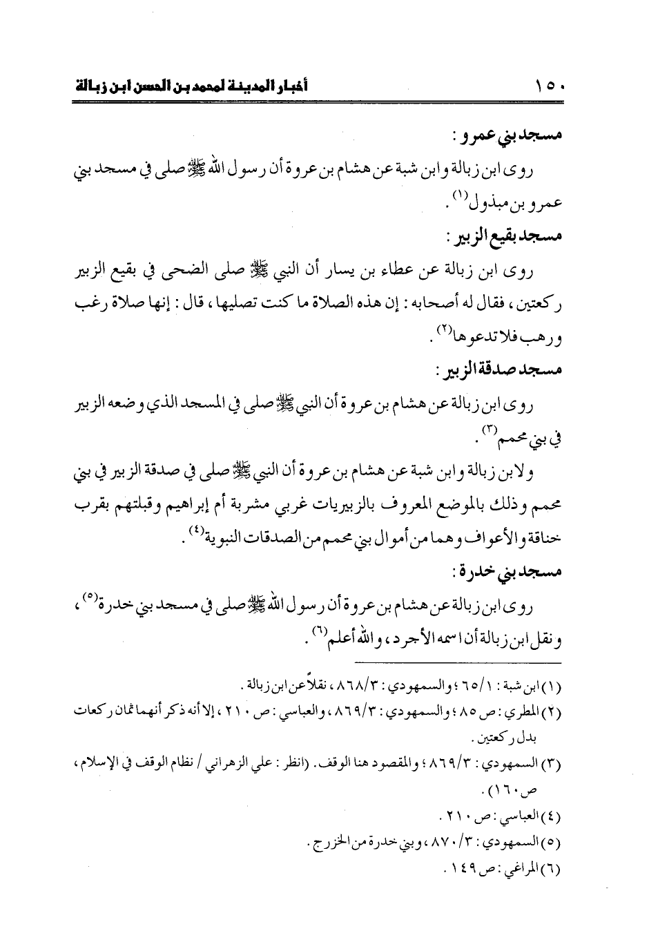 ولابن زبالة وابن شبة عن هشام بن عروة أن النبي صلى الله عليه وسلم صلى في صدقة الزبير في بني محمم وذلك بالموضع المعروف بالزبيريات غربي مشربة أم إبراهيم وقبلتهم بقرب خناقة والأعواف وهما من أموال بني محمم من الصدقات النبوية (4).