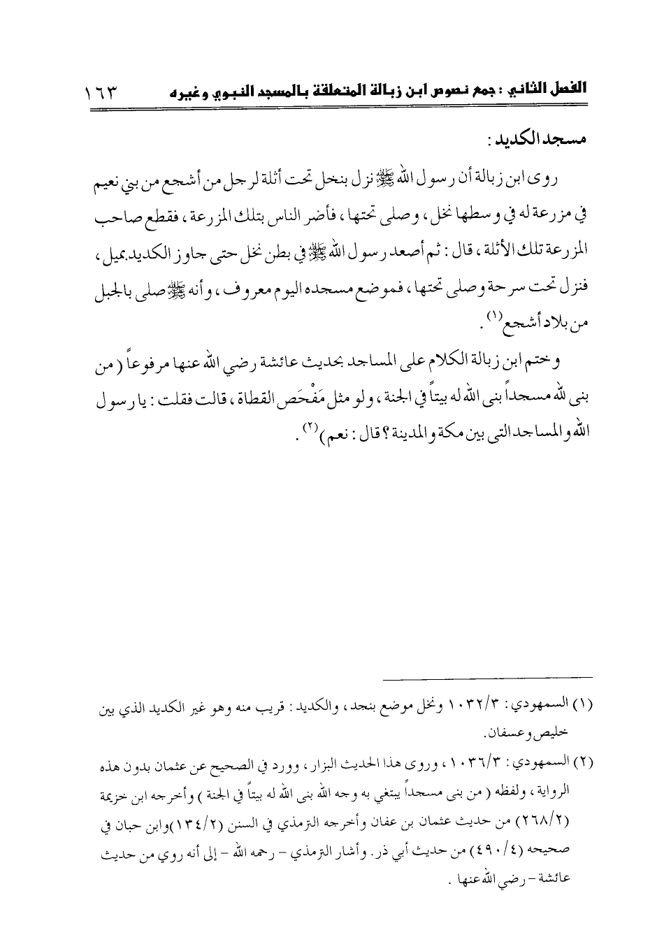 وختم ابن زبالة الكلام على المساجد بحديث عائشة رضي الله عنها مرفوعاً (من بنى لله مسجداً بنى الله له بيتاً في الجنة، ولو مثل مَفْحَص القطاة، قالت فقلت: يا رسول الله والمساجد التى بين مكة والمدينة؟ قال: نعم) (2).