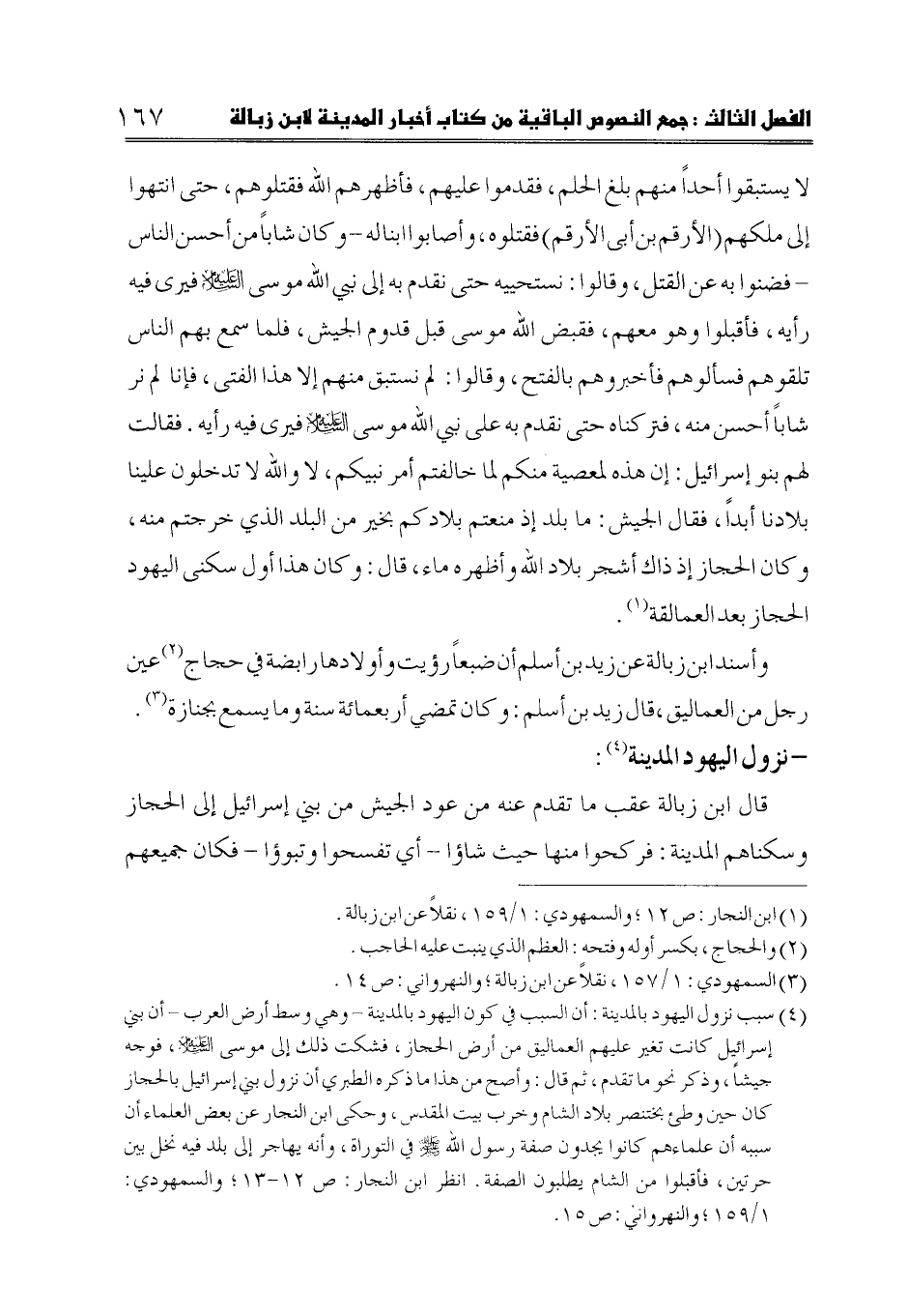 (4) سبب نزول اليهود بالمدينة: أن السبب في كون اليهود بالمدينة - وهي وسط أرض العرب - أن بني إسرائيل كانت تغير عليهم العماليق من أرض الحجاز، فشكت ذلك إلى موسى - عليه السلام -، فوجه جيشاً، وذكر نحو ما تقدم، ثم قال: وأصح من هذا ما ذكره الطبري أن نزول بني إسرائيل بالحجاز كان حين وطئ بختنصر بلاد الشام وخرب بيت المقدس، وحكى ابن النجار عن بعض العلماء أن سببه أن علماءهم كانوا يجدون صفة رسول الله صلى الله عليه وسلم في التوراة، وأنه يهاجر إلى بلد فيه نخل بين حرتين، فأقبلوا من الشام يطلبون الصفة. انظر ابن النجار: ص 12 - 13؛ والسمهودي: 1/ 159؛ والنهرواني: ص 15.
