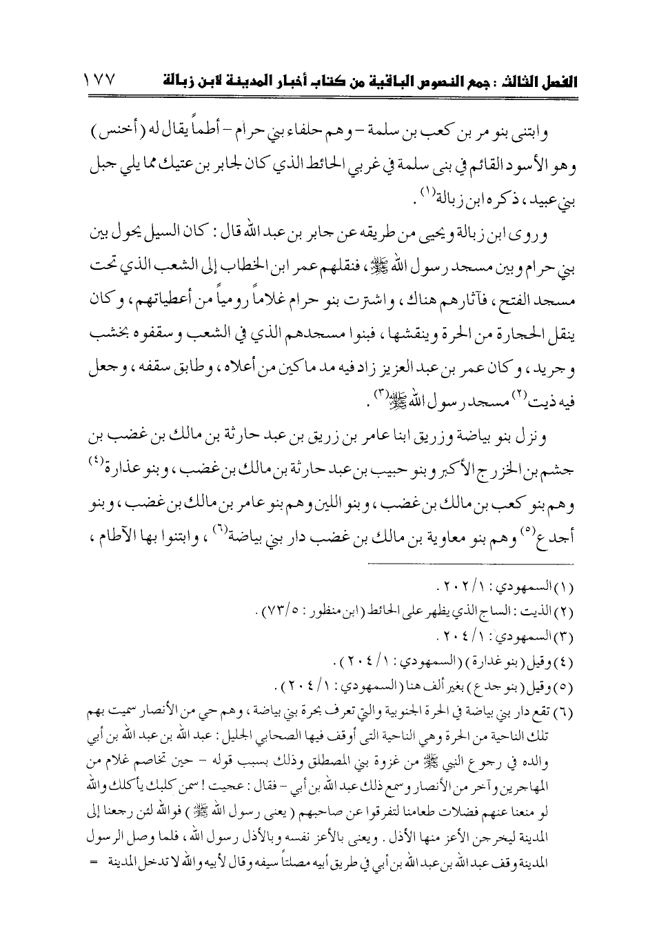 ونزل بنو بياضة وزريق ابنا عامر بن زريق بن عبد حارثة بن مالك بن غضب بن جشم بن الخزرج الأكبر وبنو حبيب بن عبد حارثة بن مالك بن غضب، وبنو عذارة (4) وهم بنو كعب بن مالك بن غضب، وبنو اللين وهم بنو عامر بن مالك بن غضب، وبنو أجدع (5) وهم بنو معاوية بن مالك بن غضب دار بني بياضة (6)، وابتنوا بها الآطام،