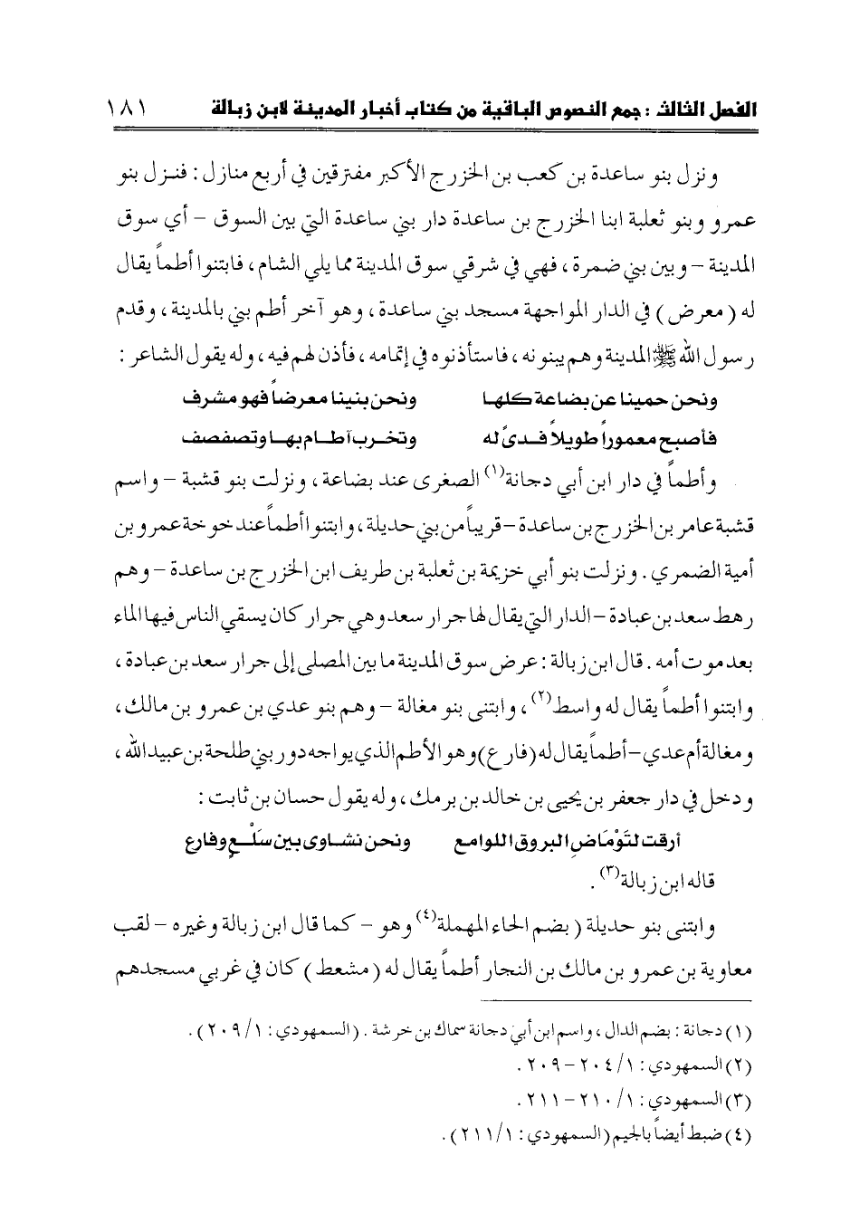 وأطماً في دار ابن أبي دجانة (1) الصغرى عند بضاعة، ونزلت بنو قشبة - واسم قشبة عامر بن الخزرج بن ساعدة - قريباً من بني حديلة، وابتنوا أطماً عند خوخة عمرو بن أمية الضمري. ونزلت بنو أبي خزيمة بن ثعلبة بن طريف ابن الخزرج بن ساعدة - وهم رهط سعد بن عبادة - الدار التي يقال لها جرار سعد وهي جرار كان يسقي الناس فيها الماء بعد موت أمه. قال ابن زبالة: عرض سوق المدينة ما بين المصلى إلى جرار سعد بن عبادة، وابتنوا أطماً يقال له واسط (2)، وابتنى بنو مغالة - وهم بنو عدي بن عمرو بن مالك، ومغالة أم عدي - أطماً يقال له (فارع) وهو الأطم الذي يواجه دور بني طلحة بن عبيد الله، ودخل في دار جعفر بن يحيى بن خالد بن برمك، وله يقول حسان بن ثابت: