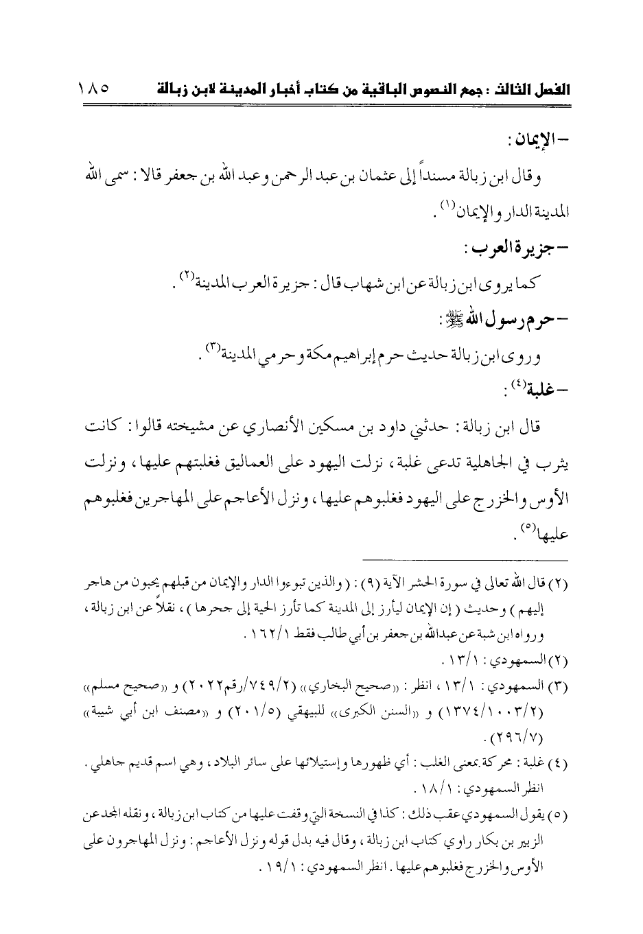 (1) قال الله تعالى في سورة الحشر الآية (9): (والذين تبوءوا الدار والإيمان من قبلهم يحبون من هاجر إليهم) وحديث (إن الإيمان ليأرز إلى المدينة كما تأرز الحية إلى جحرها)، نقلاً عن ابن زبالة، ورواه ابن شبة عن عبدالله بن جعفر بن أبي طالب فقط 1/ 162.