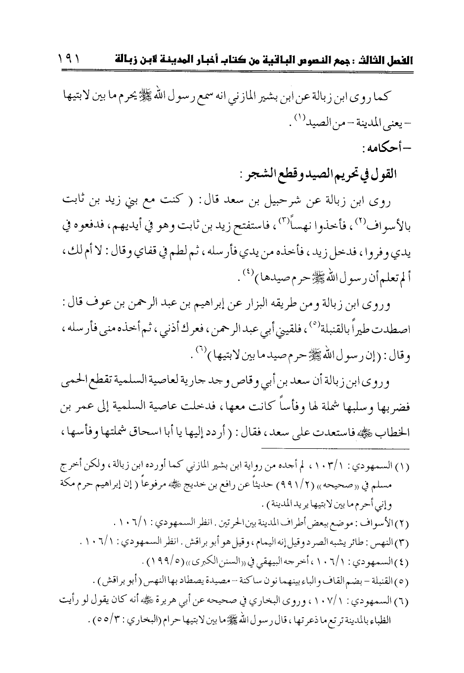 (6) السمهودي: 1/ 107، وروى البخاري في صحيحه عن أبي هريرة - رضي الله عنه - أنه كان يقول لو رأيت الظباء بالمدينة ترتع ما ذعرتها، قال رسول الله صلى الله عليه وسلم ما بين لابتيها حرام (البخاري: 3/ 55).