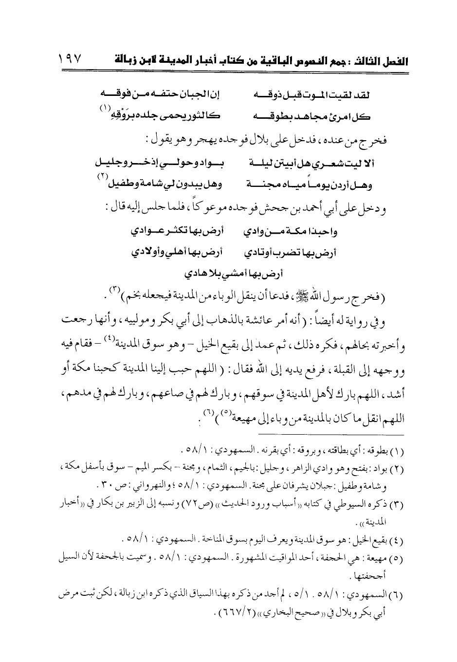 (6) السمهودي: 1/ 58. 1/ 5، لم أجد من ذكره بهذا السياق الذي ذكره ابن زبالة، لكن ثبت مرض أبي بكر وبلال في ((صحيح البخاري)) (2/ 667).
