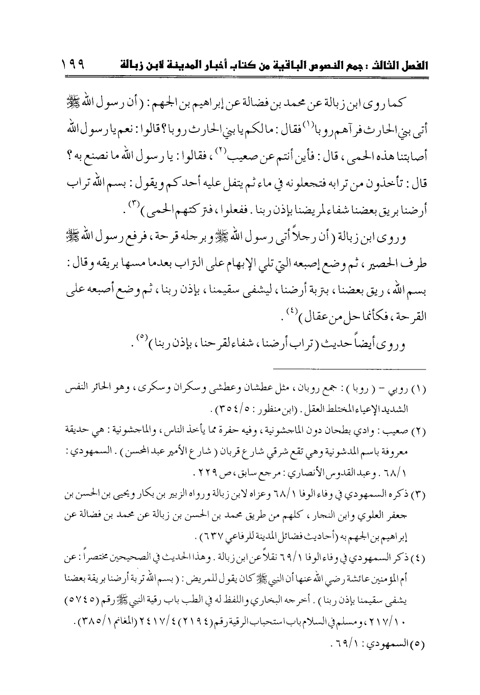 كما روى ابن زبالة عن محمد بن فضالة عن إبراهيم بن الجهم: (أن رسول الله صلى الله عليه وسلم أتى بني الحارث فرآهم روبا (1) فقال: ما لكم يا بني الحارث روبا؟ قالوا: نعم يا رسول الله أصابتنا هذه الحمى، قال: فأين أنتم عن صعيب (2)، فقالوا: يا رسول الله ما نصنع به؟ قال: تأخذون من ترابه فتجعلونه في ماء ثم يتفل عليه أحدكم ويقول: بسم الله تراب أرضنا بريق بعضنا شفاء لمريضنا بإذن ربنا. ففعلوا، فتركتهم الحمى) (3).