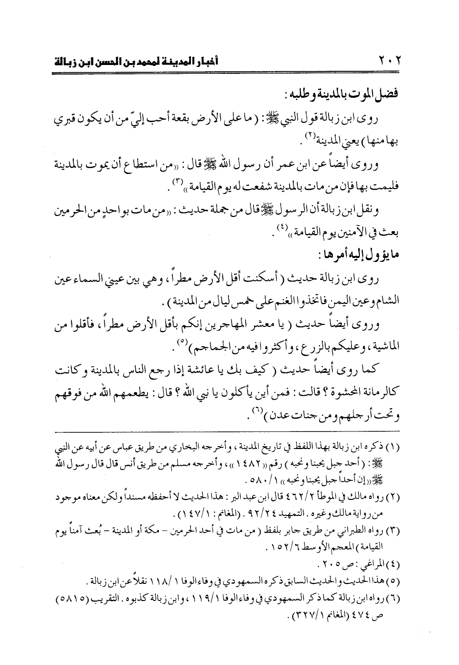 ونقل ابن زبالة أن الرسول صلى الله عليه وسلم قال من جملة حديث: ((من مات بواحدٍ من الحرمين بعث في الآمنين يوم القيامة)) (4).