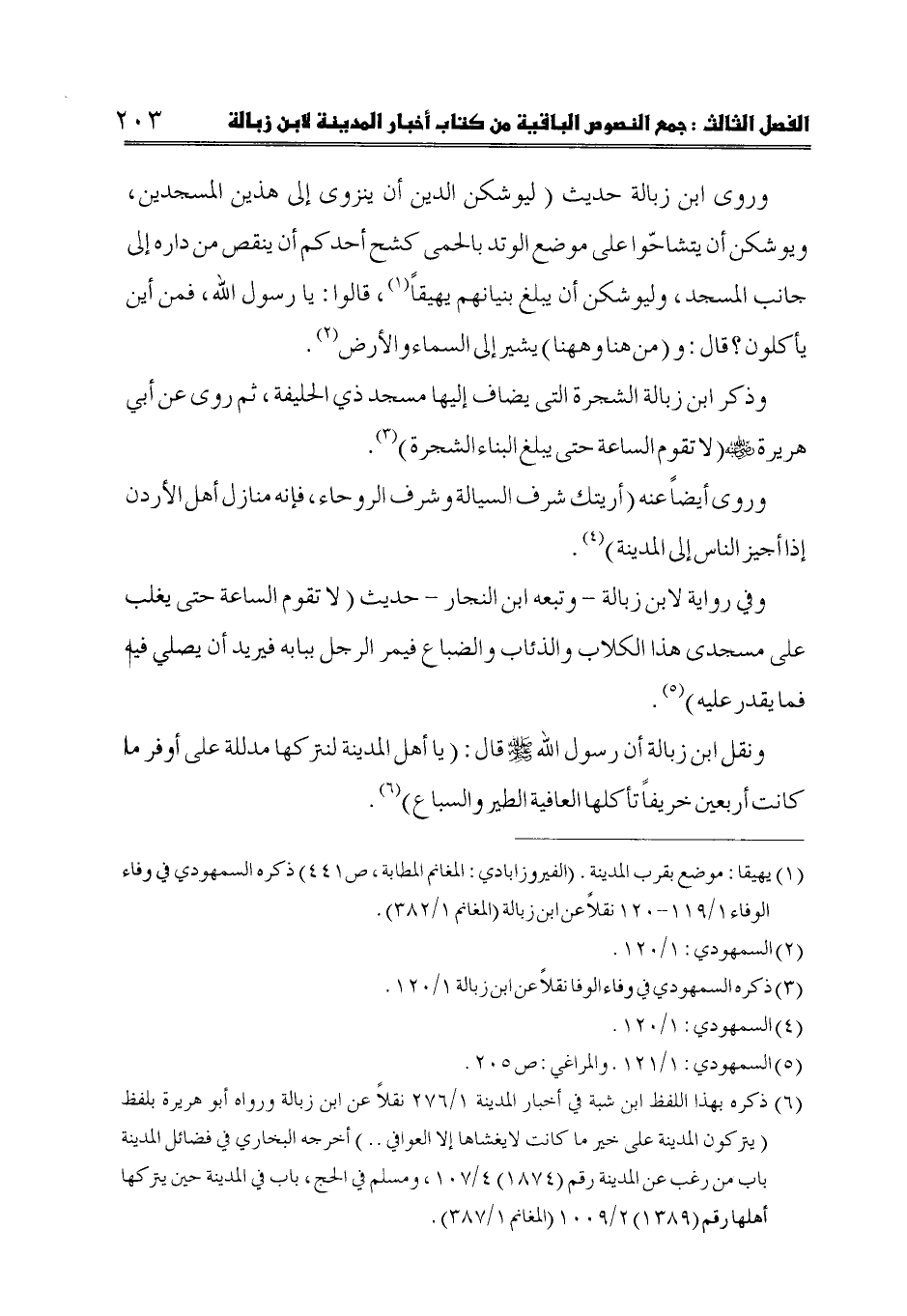 (6) ذكره بهذا اللفظ ابن شبة في أخبار المدينة 1/ 276 نقلاً عن ابن زبالة ورواه أبو هريرة بلفظ (يتركون المدينة على خير ما كانت لايغشاها إلا العوافي .. ) أخرجه البخاري في فضائل المدينة باب من رغب عن المدينة رقم (1874) 4/ 107، ومسلم في الحج، باب في المدينة حين يتركها أهلها رقم (1389) 2/ 1009 (المغانم 1/ 387).
