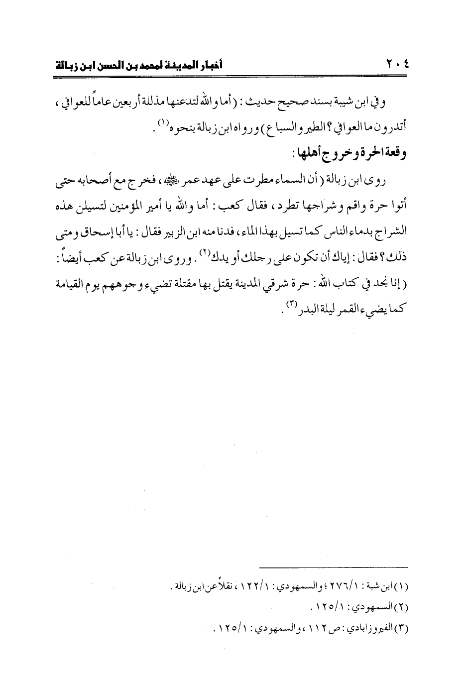 روى ابن زبالة (أن السماء مطرت على عهد عمر (، فخرج مع أصحابه حتى أتوا حرة واقم وشراجها تطرد، فقال كعب: أما والله يا أمير المؤمنين لتسيلن هذه الشراج بدماء الناس كما تسيل بهذا الماء، فدنا منه ابن الزبير فقال: يا أبا إسحاق ومتى ذلك؟ فقال: إياك أن تكون على رجلك أو يدك (2). وروى ابن زبالة عن كعب أيضاً: (إنا نجد في كتاب الله: حرة شرقي المدينة يقتل بها مقتلة تضيء وجوههم يوم القيامة كما يضيء القمر ليلة البدر (3).