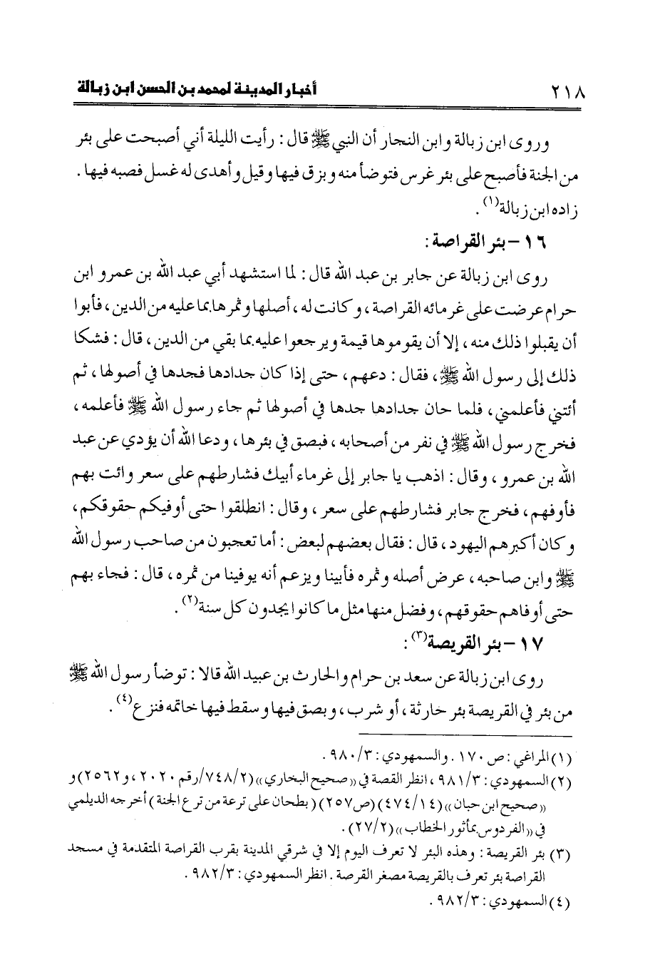(2) السمهودي: 3/ 981، انظر القصة في ((صحيح البخاري)) (2/ 748/رقم 2020، و2562) و ((صحيح ابن حبان)) (14/ 474) (ص257) (بطحان على ترعة من ترع الجنة) أخرجه الديلمي في ((الفردوس بمأثور الخطاب)) (2/ 27).