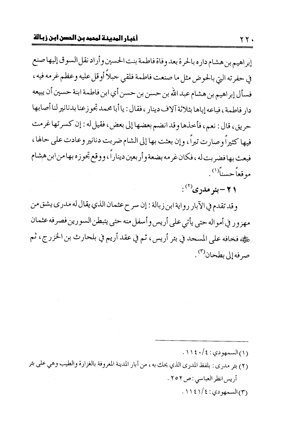 (2) بئر مدرى: بلفظ المدرى الذي يحك به، من آبار المدينة المعروفة بالغزارة والطيب وهي على بئر أريس انظر العباسي: ص 252.