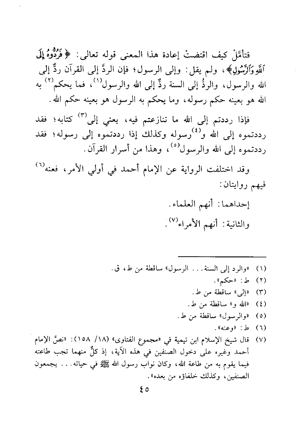 (¬1) "والرد إلى السنة. . . الرسول" ساقطة من ط، ق.