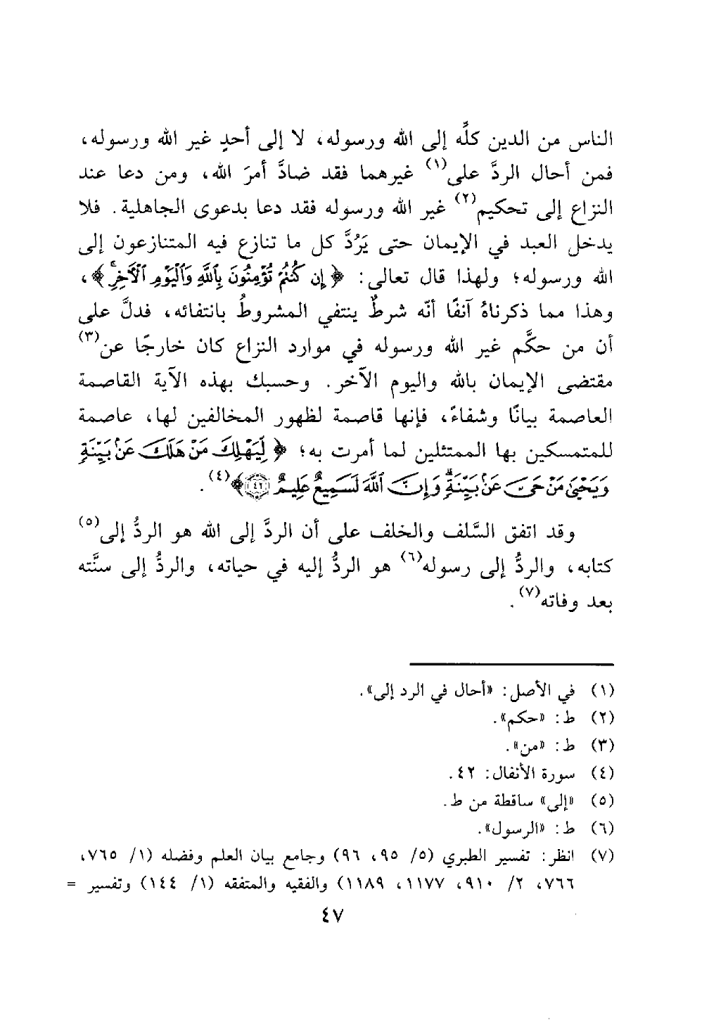 الناس من الدين كلِّه إلى الله ورسوله، لا إلى أحدٍ غير الله ورسوله، فمن أحال الردَّ على (¬1) غيرهما فقد ضادَّ أمرَ الله، ومن دعا عند النزاع إلى تحكيم (¬2) غير الله ورسوله فقد دعا بدعوى الجاهلية. فلا يدخل العبد في الإيمان حتى يَرُدَّ كل ما تنازع فيه المتنازعون إلى الله ورسوله؛ ولهذا قال تعالى: {إِنْ كُنْتُمْ تُؤْمِنُونَ بِاللَّهِ وَالْيَوْمِ الْآخِرِ}، وهذا مما ذكرناهُ آنفًا أنّه شرطٌ ينتفي المشروطُ بانتفائه، فدلَّ على أن من حكَّم غير الله ورسوله في موارد النزاع كان خارجًا عن (¬3) مقتضى الإيمان بالله واليوم الآخر. وحسبك بهذه الآية القاصمة العاصمة بيانًا وشفاءً، فإنها قاصمة لظهور المخالفين لها، عاصمةٌ للمتمسكين بها الممتثلين لما أمرت به؛ {لِيَهْلِكَ مَنْ هَلَكَ عَنْ بَيِّنَةٍ وَيَحْيَى مَنْ حَيَّ عَنْ بَيِّنَةٍ وَإِنَّ اللَّهَ لَسَمِيعٌ عَلِيمٌ (42)} (¬4).