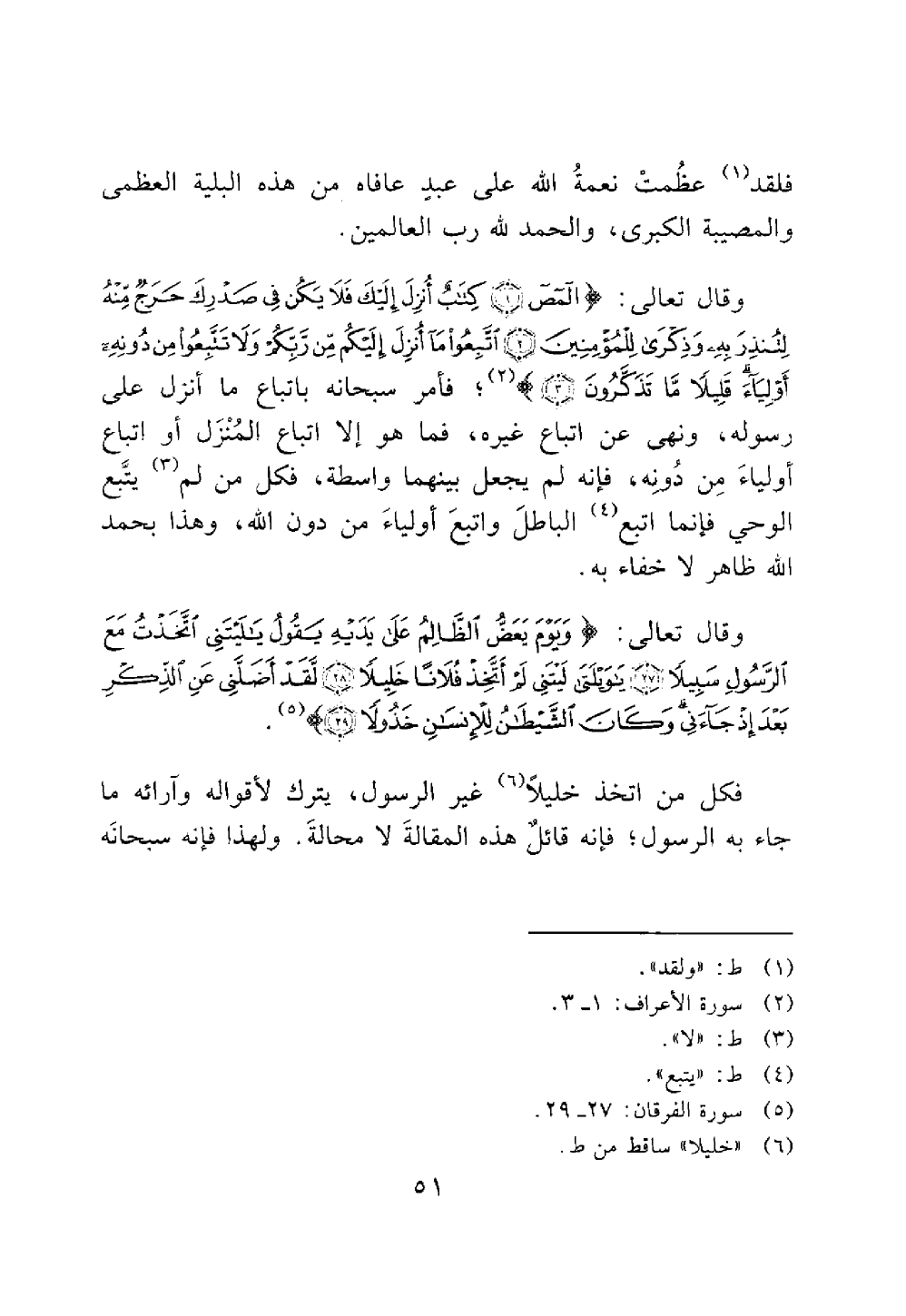 فكل من اتخذ خليلًا (¬6) غير الرسول، يترك لأقواله وآرائه ما جاء به الرسول؛ فإنه قائلٌ هذه المقالةَ لا محالةَ. ولهذا فإنه سبحانَه