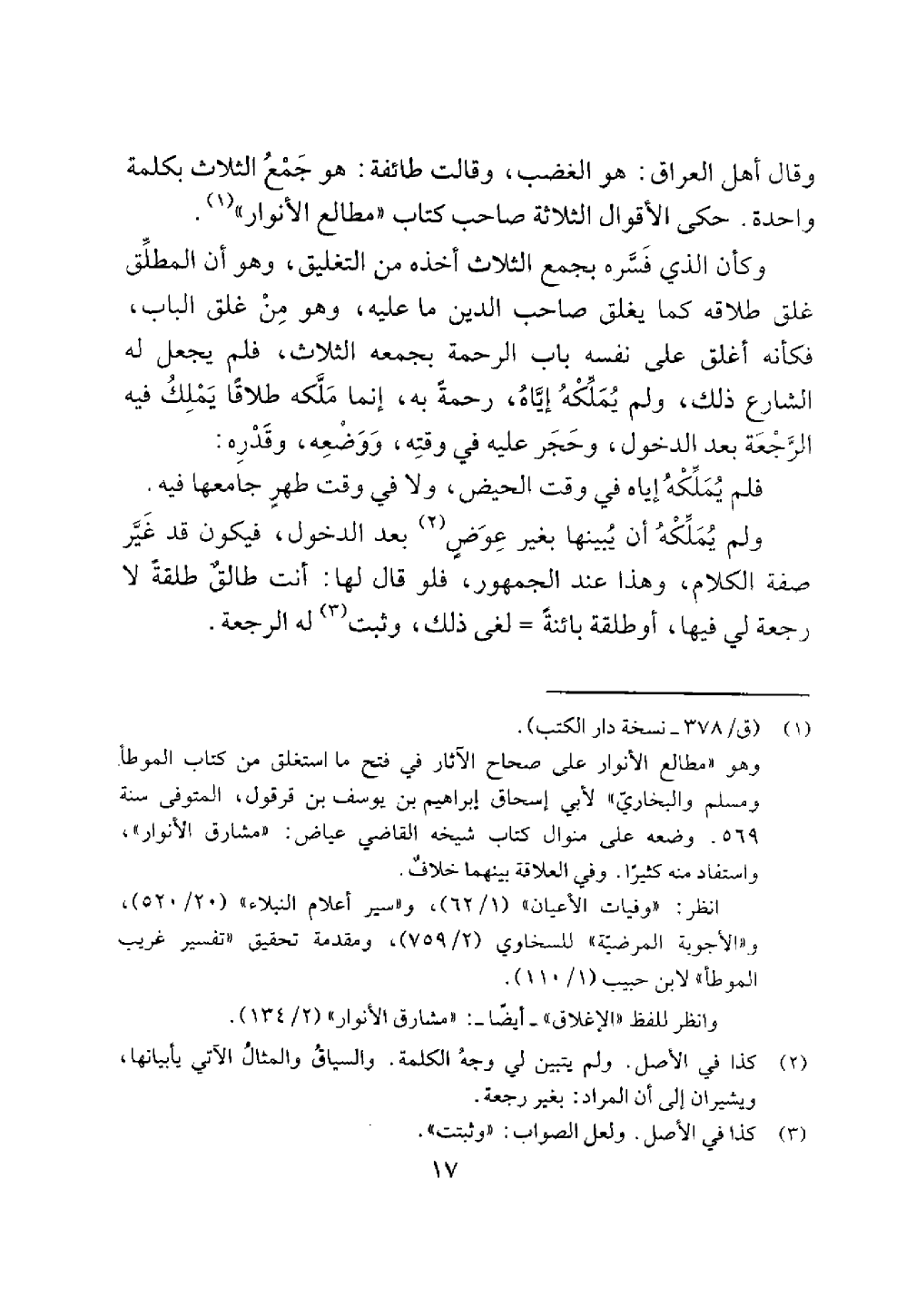 وقال أهل العراق: هو الغضب، وقالت طائفة: هو جَمْعُ الثلاث بكلمة واحدة حكى الأقوال الثلاثة صاحب كتاب "مطالع الأنوار" (¬1).