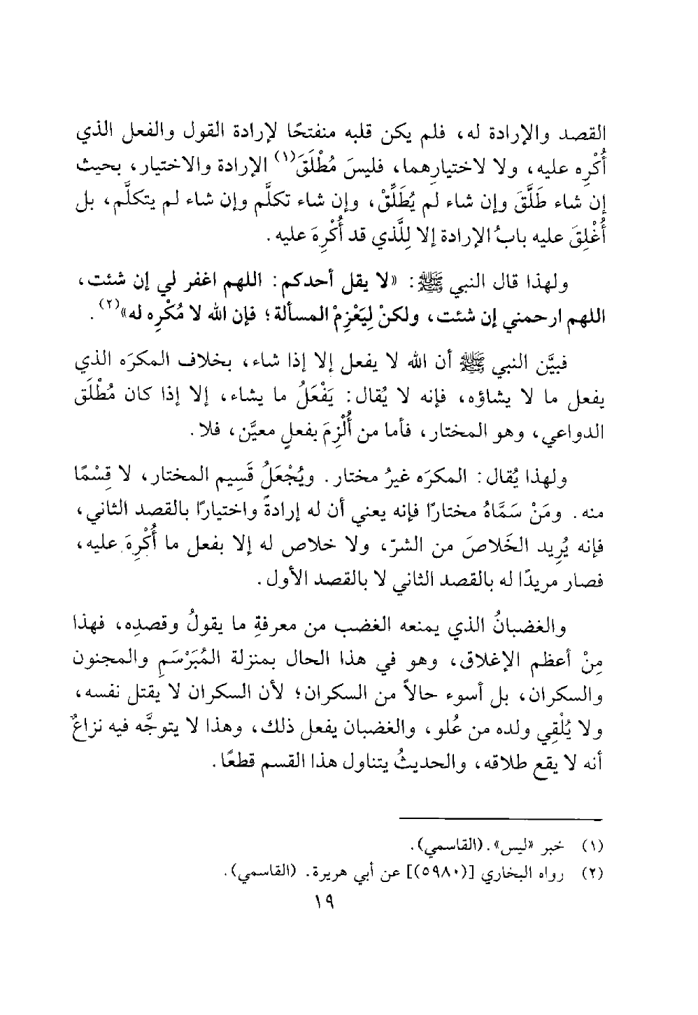 فبيَّن النبي - صلى الله عليه وسلم - أن الله لا يفعل إلا إذا شاء، بخلاف المكرَه الذي يفعل ما لا يشاؤه، فإنه لا يُقال: يَفْعَل ما يشاء، إلا إذَا كان مُطْلَق الدواعي، وهو المختار، فأما من أُلْزِمَ بفعل معيَّن، فلا.