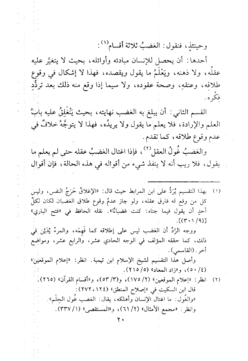 (¬1) بهذا التقسيم يُرَدُّ على ابن المرابط حيث قال: "الإغلاق حَرَجُ النفس، وليس كل من وقع له فارق عقله , ولو جاز عدمُ وقوع طلاق الغضبان لكان لكل أحدٍ أن يقول فيما جناه: كنت غضبانًا". نقله الحافظ في "فتح الباري" [(9/ 301)].