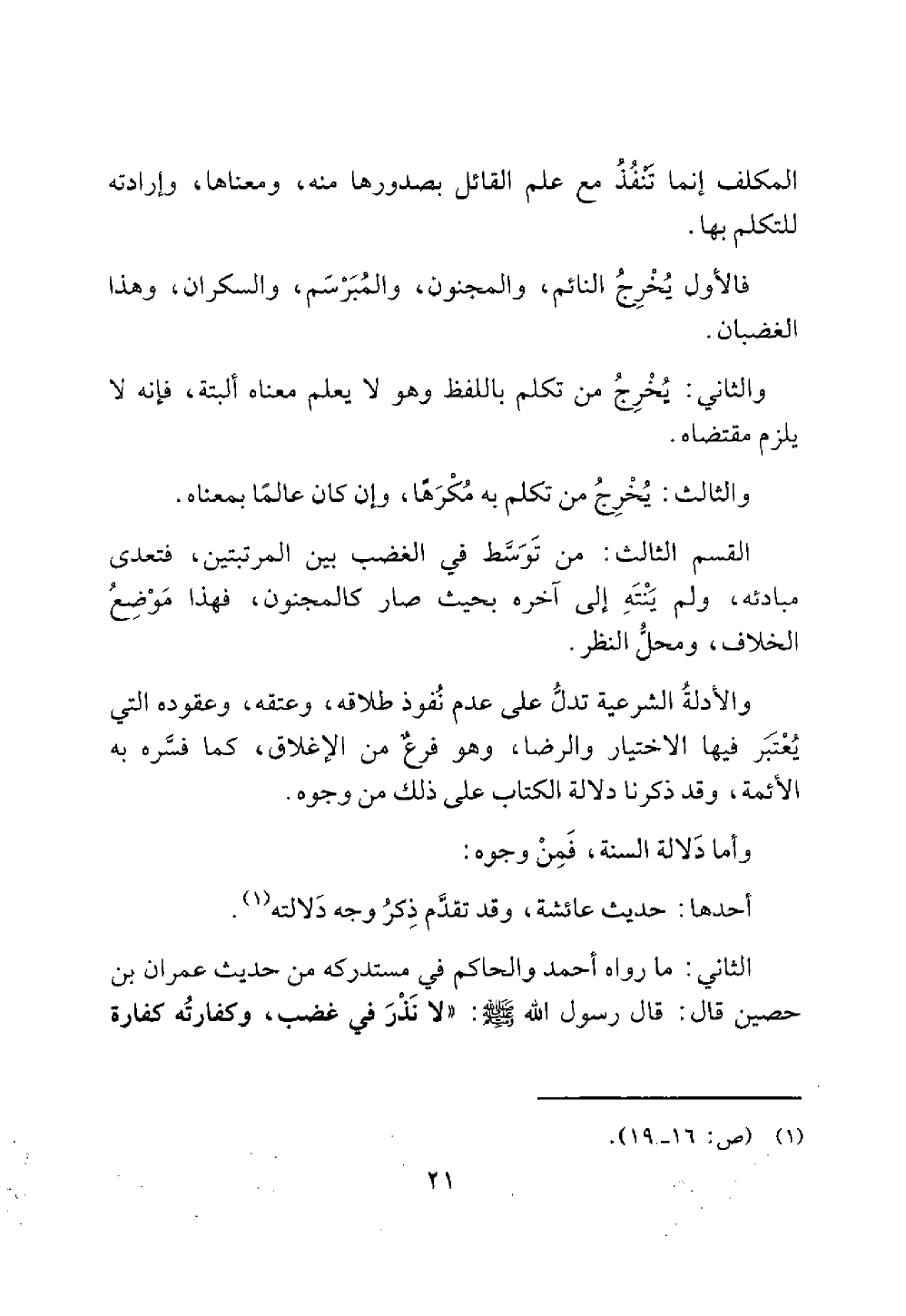 فالأول يُخْرِجُ النائم، والمجنون، والمبَرْسَم، والسكران، وهذا الغضبان.