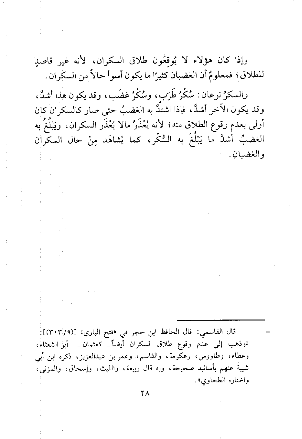 = قال القاسمي: قال الحافظ ابن حجر فى "فتح الباري" (9/ 303)]: "وذهب إلى عدم وقوع طلاق السكران أيضًا- كعثمان-: أبو الشعثاء، وعطاء، وطاووس، وعكرمة، والقاسم، وعمر بن عبد العزيز، ذكره ابن أبي شيبة عنهم بأسانيد صحيحة، وبه قال ربيعة، والليث، وإسحاق، والمزني، واختاره الطحاوي".