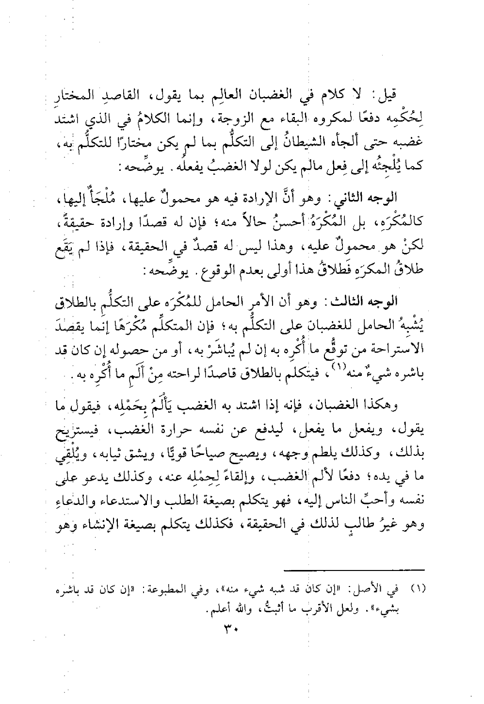 قيل: لا كلام في الغضبان العالِم بما يقول، القاصدِ المختارِ لِحُكْمِه دفعًا لمكروه البقاء مع الزوجة، وإنما الكلامُ في الذي أشتد غصْبه حتى ألجأه الشيطان إلى التكلُّم بما لم يكن مختارًا للتكلُّم به، كما يُلْجِئه إلى فِعل مالم يكن لولا الغضبُ يفعله. يوضِّحه: