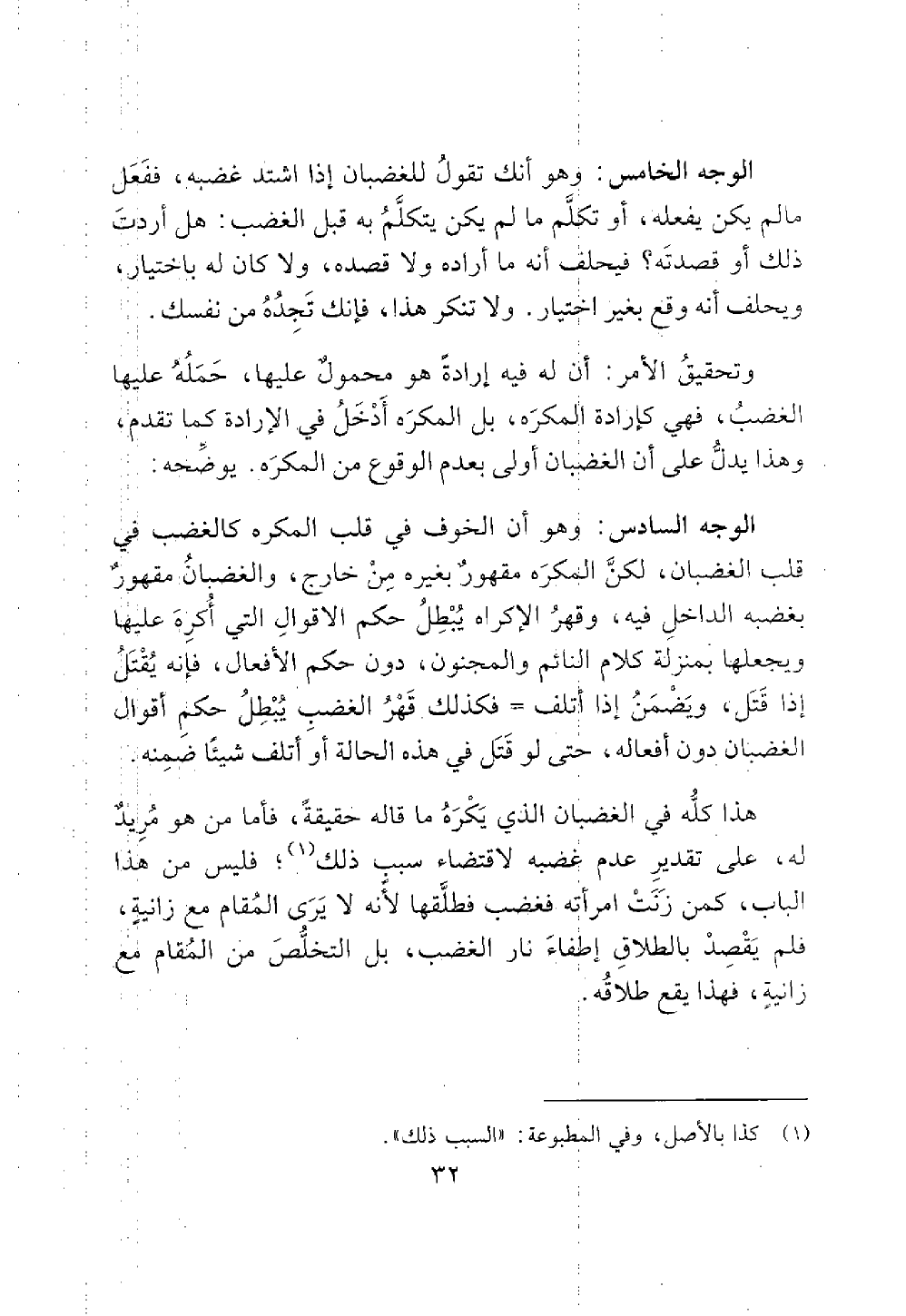 الوجه الخامس: هو أنك تقولُ للغضبان إذا اشتد غضبه، ففَعَل مالم يكن يفعله، أو تكلَّم ما لم يكن يتكلَّمُ به قبل الغضب: هل أردتَ ذلك أو قصدتَه؟ فيحلف أنه ما أراده ولا قصده، ولا كان له باختيار، ويحلف أنه وقع بغير اختيار. ولا تنكر هذا، فإنك تَجِدُهُ من نفسك.
