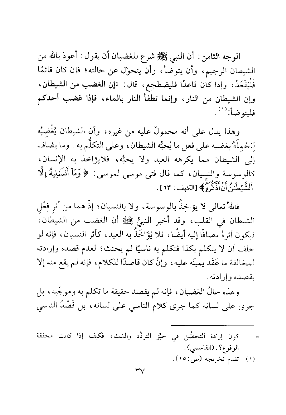 وهذا يدل على أنه محمولٌ عليه من غيره، وأن الشيطان يُغْضِبُه لِيَحْمِلَهُ بغضبه على فعن ما يُحبُّه الشيطان، وعلى التكلُّم به. وما يضاف إلى الشيطان مما يكرهه العبد ولا يحبُّه, فلا يؤاخذ به الإنسان، كالوسوسة والنسيان، كما قال فتى موسى لموسى: {وَمَا أَنْسَانِيهُ إِلَّا الشَّيْطَانُ أَنْ أَذْكُرَهُ} [الكهف: 63].