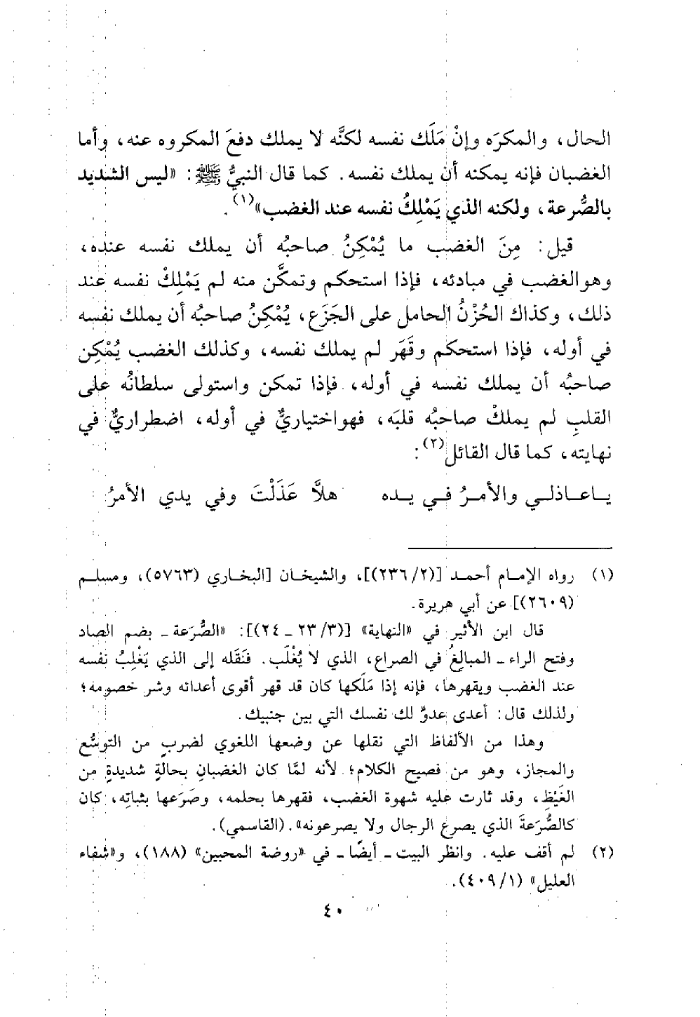 قيل: مِنَ الغضب ما يُمْكِنُ صاحبُه أن يملك نفسه عنده، وهو الغضب في مبادئه، فإذا استحكم وتمكَّن منه لم يَمْلِكْ نفسه عند ذلك، وكذاك الحُزْنُ الحامل على الجَزَع، يُمْكِنُ صاحبُه أن يملك نفسه في أوله، فإذا استحكم وقَهَر لم يملك نفسه، وكذلك الغضب يُمْكِن صاحبُه أن يملك نفسه في أوله، فإذا تمكن واستولى سلطانُه غلي القلبِ لم يملكْ صاحبُه قلبَه، فهو اختياريٌّ في أوله، اضطراريٌّ في نهايته، كما قال القائل (¬2):