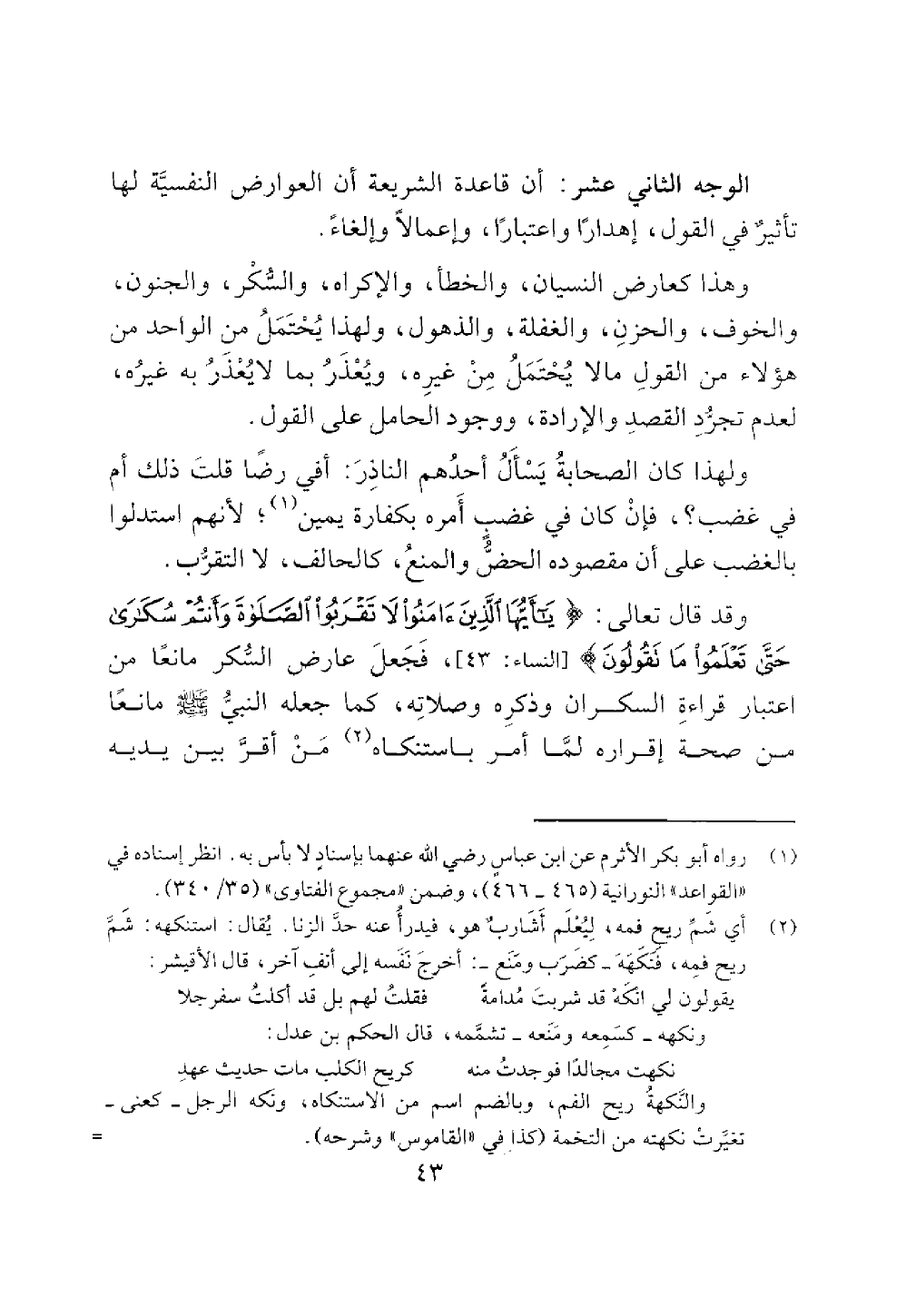 الوجه الثاني عشر: أن قاعدة الشريعة أن العوارض النفسيَّة لها تأثيرٌ في القول، إهدارًا واعتبارًا، وإعمالًا وإلغاءً.