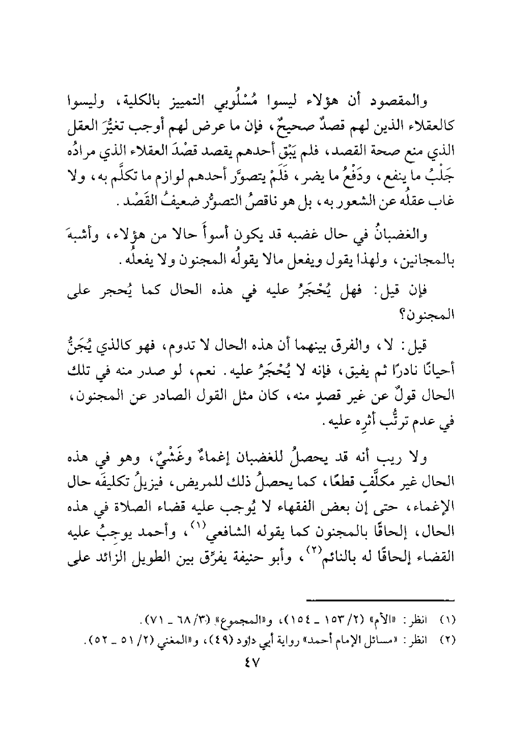 والمقصود أن هؤلاء ليسوا مُسْلُوبي التمييز بالكلية، وليسوا كالعقلاء الذين لهم قصدٌ صحيحٌ، فإن ما عرض لهم أوجب تغيُّرَ العقل الذي منع صحة القصد، فلم يَبْق أحدهم يقصد قصْدَ العقلاء الذي مرادُه جَلْبُ ما ينفع، ودَفْعُ ما يضر، فَلَمْ يتصوَّر أحدهم لوازم ما تكلَّم به، ولا غاب عقلُه عن الشعور به، بل هو ناقصُ التصوُّر ضعيفُ القَصْد.