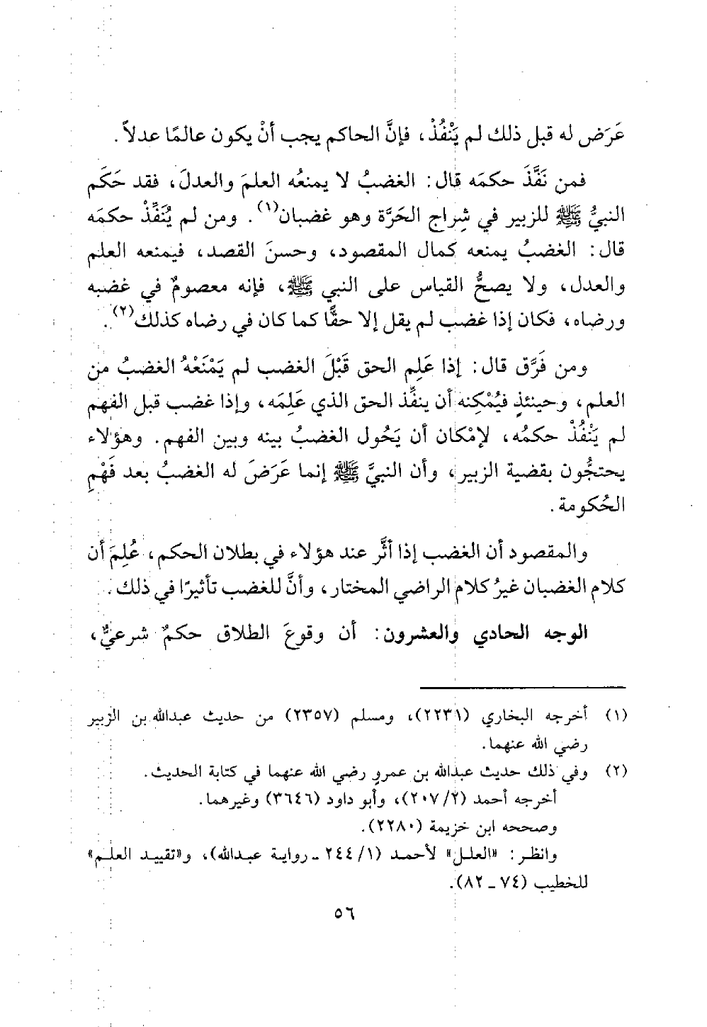 فمن نَفَّذَ حكمَه قال: الغضبُ لا يمنعُه العلمَ والعدلَ، فقد حَكَم النبيُّ - صلى الله عليه وسلم - للزبير في شِراج الحَرَّة وهو غضبان (¬1). ومن لم يُنَفِّذْ حكمَه قال: الغضبُ يمنعه كمال المقصود، وحسنَ القصد، فيمنعه العلم والعدل، ولا يصحُّ القياس على النبي - صلى الله عليه وسلم -، فإنه معصومٌ في غضبه ورضاه، فكان إذا غضب لم يقل إلا حقًّا كما كان في رضاه كذلك (¬2).