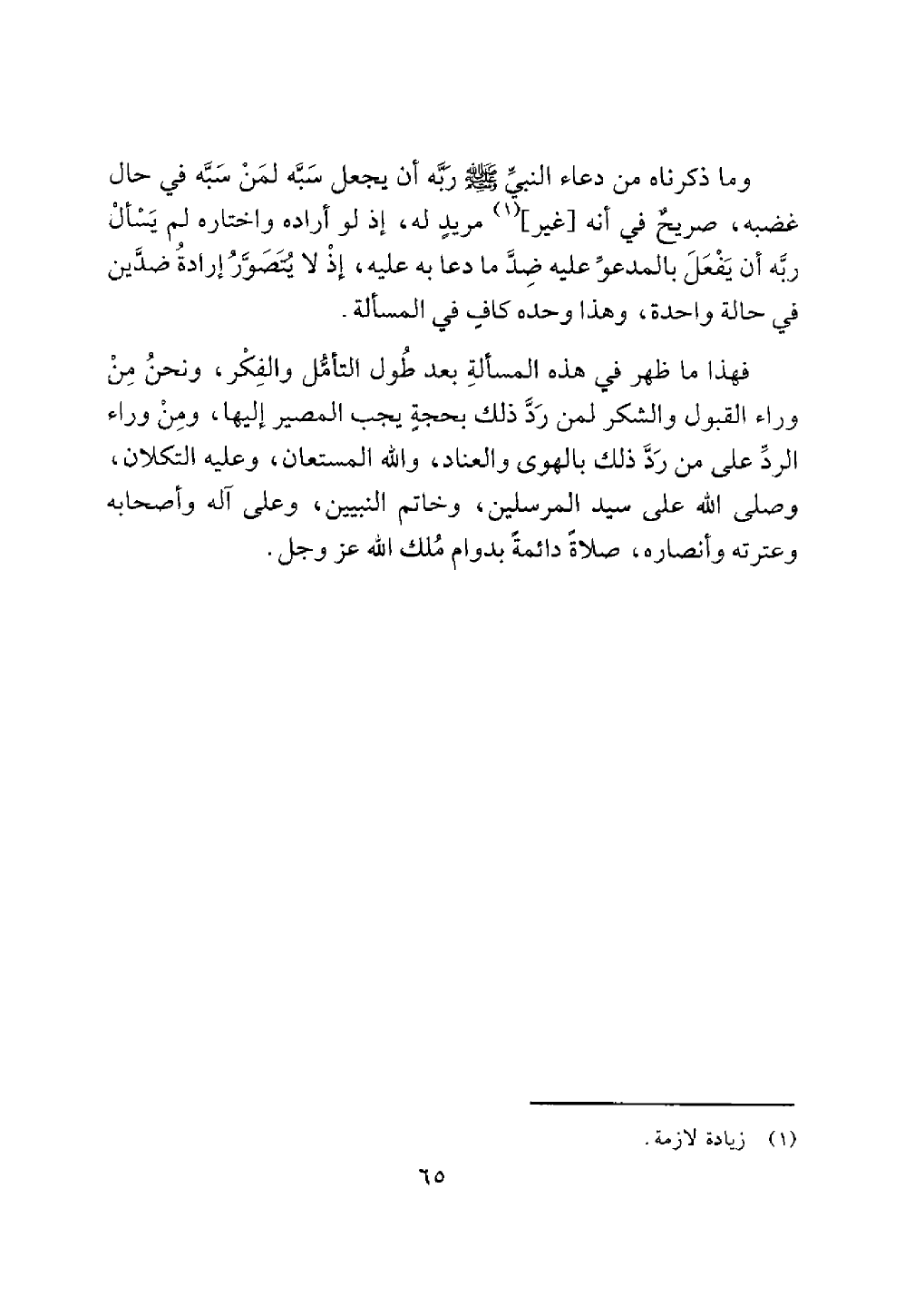 وما ذكرناه من دعاء النبيِّ - صلى الله عليه وسلم - رَبَّه أن يجعل سبَّه لمَنْ سَبَّه في حال غضبه، صريحٌ في أنه [غير] (¬1) مريدٍ له، إذ لو أراده واختاره لم يَسْألْ ربَّه أن يَفْعَلَ بالمدعوِّ عليه ضِدَّ ما دعا به عليه، إذْ لا يُتَصَوَّرُ إرادةُ ضدَّين في حالة واحدة، وهذا وحده كافٍ في المسألة.