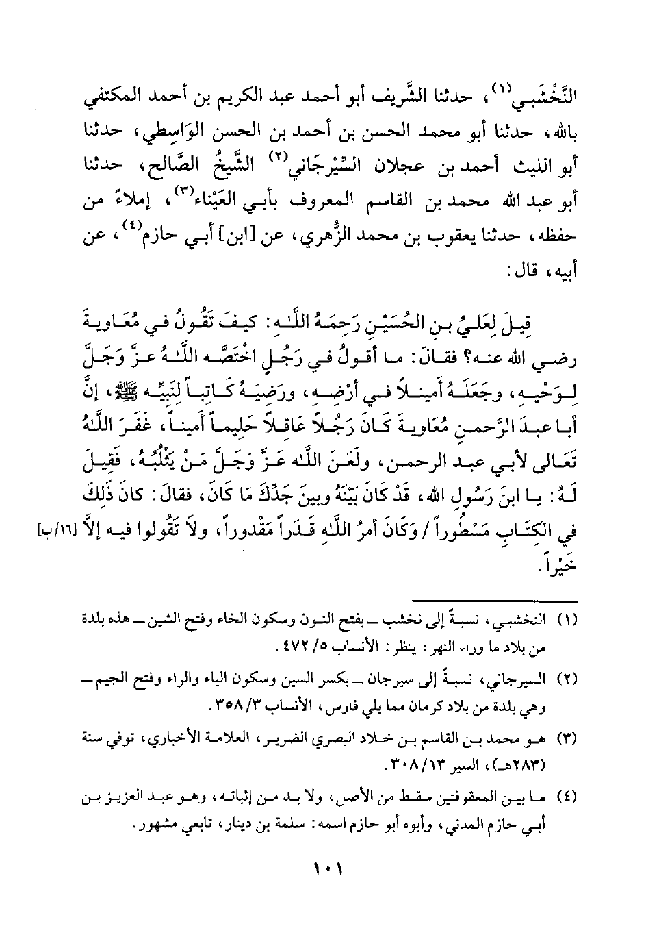 النَّخْشَبِيُّ , حَدَّثَنَا الشَّرِيفُ أَبُو أَحْمَدَ عَبْدُ الْكَرِيمِ بْنُ أَحْمَدَ الْمُكْتَفِي بِاللَّهِ , حَدَّثَنَا أَبُو مُحَمَّدٍ الْحَسَنُ بْنُ أَحْمَدَ بْنِ الْحَسَنِ الْوَاسِطِيُّ , حَدَّثَنَا أَبُو اللَّيْثِ أَحْمَدُ بْنُ عَجْلَانَ السِّيرَجَانِيُّ الشَّيْخُ الصَّالِحُ , حَدَّثَنَا أَبُو عَبْدِ اللَّهِ مُحَمَّدُ بْنُ الْقَاسِمِ الْمَعْرُوفُ بِأَبِي الْعَيْنَاءِ إِمْلاءً مِنْ حِفْظِهِ , حَدَّثَنَا يَعْقُوبُ بْنُ مُحَمَّدٍ الزُّهْرِيُّ , عَنِ ابْنِ أَبِي حَازِمٍ , عَنْ أَبِيهِ , قَالَ: قِيلَ لِعَلِيِّ بْنِ الْحُسَيْنِ رَحِمَهُ اللَّهُ: كَيْفَ تَقُولُ فِي مُعَاوِيَةَ رَضِيَ اللَّهُ عَنْهُ؟ فَقَالَ: مَا أَقُولُ فِي رَجُلٍ اخْتَصَّهُ اللَّهُ عَزَّ وَجَلَّ لِوَحْيِهِ , وَجَعَلَهُ أَمِينًا فِي أَرْضِهِ , وَرَضِيَهُ كَاتِبًا لِنَبِيِّهِ صَلَّى اللَّهُ عَلَيْهِ وَسَلَّمَ , إِنَّ أَبَا عَبْدِ الرَّحْمَنِ مُعَاوِيَةَ كَانَ رَجُلا عَاقِلا حَلِيمًا أَمِينًا , غَفَرَ اللَّهُ تَعَالَى لأَبِي عَبْدِ الرَّحْمَنِ , وَلَعَنَ اللَّهُ عَزَّ وَجَلَّ مَنْ يَثْلِبُهُ , فَقِيلَ لَهُ: يَا ابْنَ رَسُولِ اللَّهِ , قَدْ كَانَ بَيْنَهُ وَبَيْنَ جَدِّكَ مَا كَانَ , فَقَالَ: كَانَ ذَلِكَ فِي الْكِتَابِ مَسْطُورًا , وَكَانَ أَمْرُ اللَّهِ قَدَرًا مَقْدُورًا , وَلا تَقُولُوا فِيهِ إِلَّا خَيْرًا،
