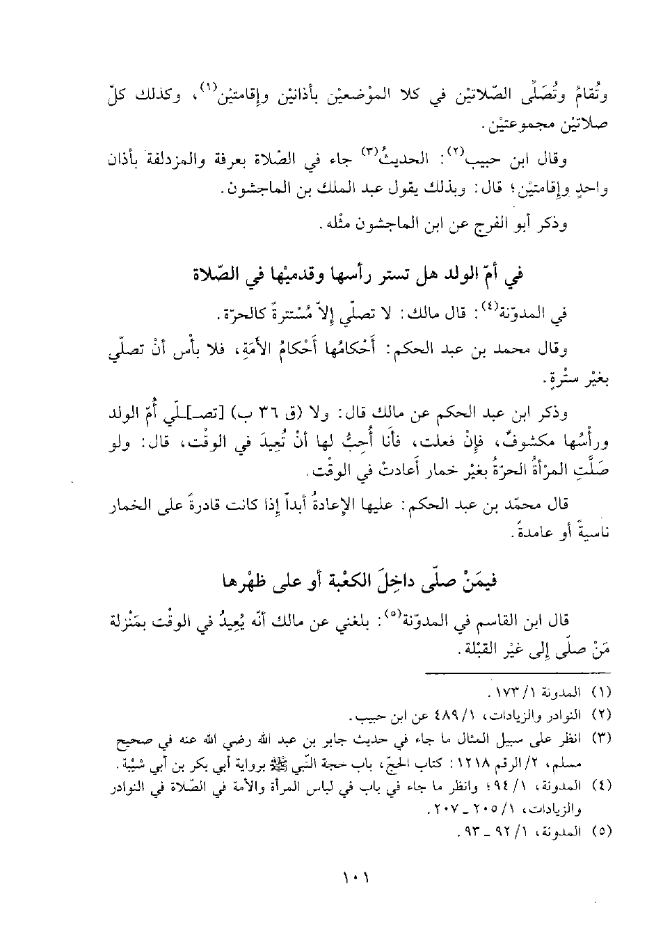 (¬4) المدونة، 1/ 94؛ وانظر ما جاء في باب في لباس المرأة والأمة في الصلاة في النوادر والزيادات، 1/ 205 - 207.