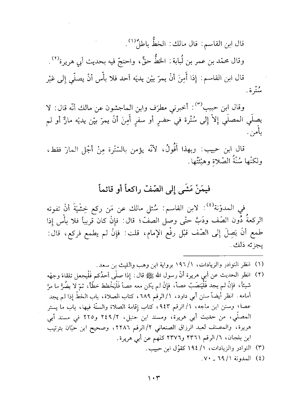 (¬2) انظر الحديث عن أبي هريرة أن رسول الله (ص) قال: إذا صلى أحدكم فليجعل تلقاء وجهه شيئا، فإن لم يجد فلينصب عصا، فإن لم يكن معه عصا فليخطط خطا، ثم لا يضر ما مر أمامه. انظر أيضا سنن أبي داود، 1/ الرقم 689، كتاب الصلاة، باب الخط إذا لم يجد عصا؛ وسنن ابن ماجه، 1/ الرقم 943، كتاب إقامة الصلاة والسنة فيها، باب ما يستر المصلي، من حديث أبي هريرة، ومسند ابن حنبل، 2/ 249 و 225 في مسند أبي هريرة، والمصنف لعبد الرزاق الصنعاني 2/ الرقم 2286، وصحيح ابن حبان بترتيب ابن بلجان، 6/ الرقم 2361 و 2376 كلهم عن أبي هريرة.