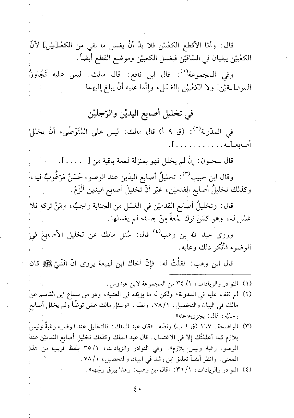(¬3) الواضحة. 167 (ق 4 ب) ونصه: ((قال عبد الملك: فالتخليل عند الوضوء رغبة وليس بلازم كما أعلمتك إلا في الاغتسال. قال عبد الملك وكذلك تخليل أصابع القدمين عند الوضوء رغبة وليس بلازم)). وفي النوادر والزيادات، 1/ 35 بلفظ قريب من هذا المعنى. وانظر أيضا تعليق ابن رشد في البيان والتحصيل، 1/ 78.