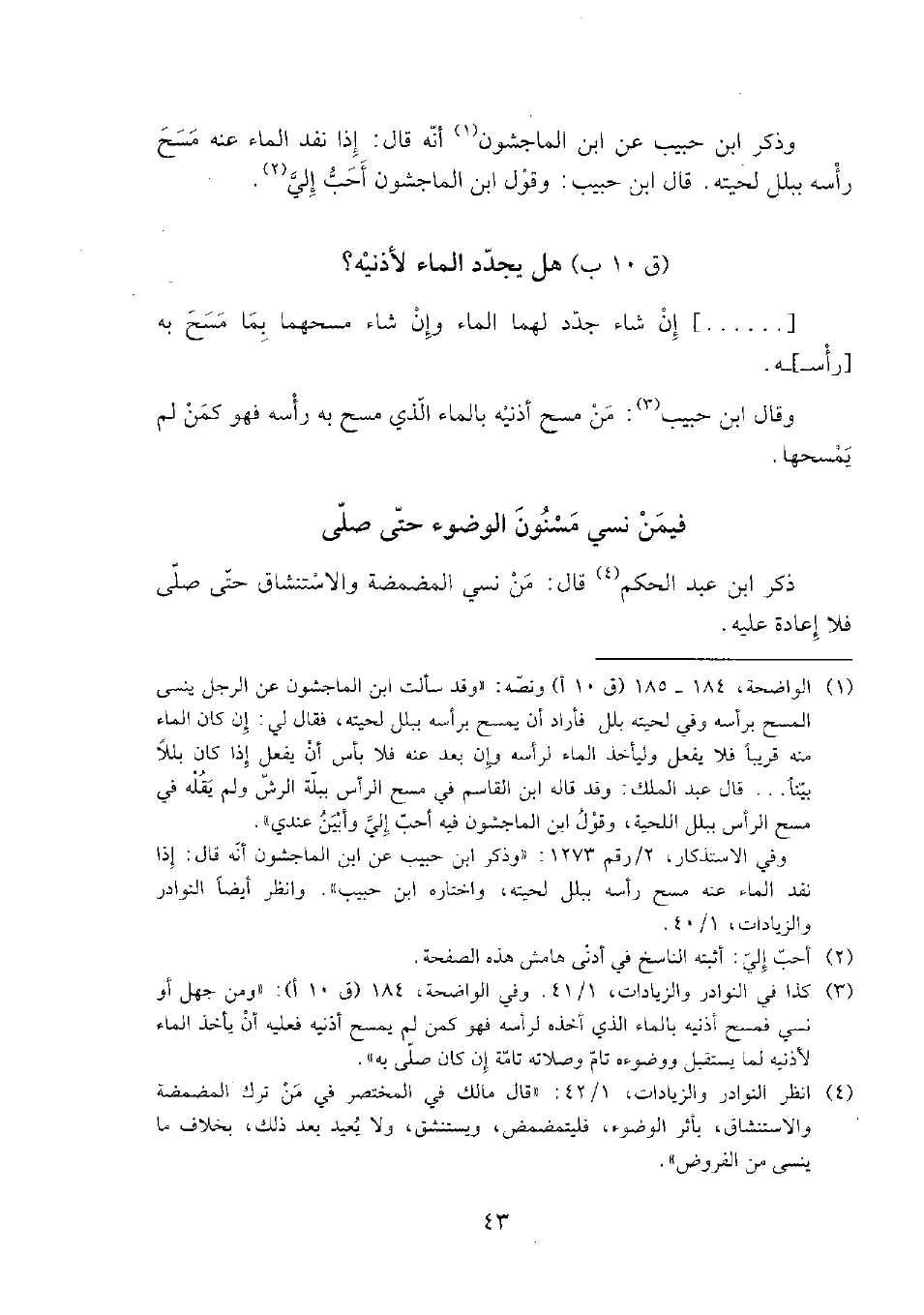 (¬1) الواضحة، 184 - 185 (ق 10 أ) ونصه: ((وقد سألت ابن الماجشون عن الرجل ينسى المسح برأسه وفي لحيته بلل فأراد أن يمسح برأسه ببلل لحيته، فقال لي: إن كان الماء منه قريبا فلا يفعل وليأخذ الماء لرأسه وإن بعد عنه فلا بأس أن يفعل إذا كان بللا بينا ... قال عبد الملك: وقد قال ابن القاسم في مسح الرأس ببلة الرش ولم يقله في مسح الرأس ببلل اللحية، وقول ابن الماجشون فيه أحب إلي وأبين عندي)). وفي الاستذكار، 2/ رقم 1273: ((وذكر ابن حبيب عن ابن الماجشون أنه قال: إذا نفد الماء عنه مسح رأسه ببلل لحيته، واختاره ابن حبيب)). وانظر أيضا النوادر والزيادات، 1/ 40.