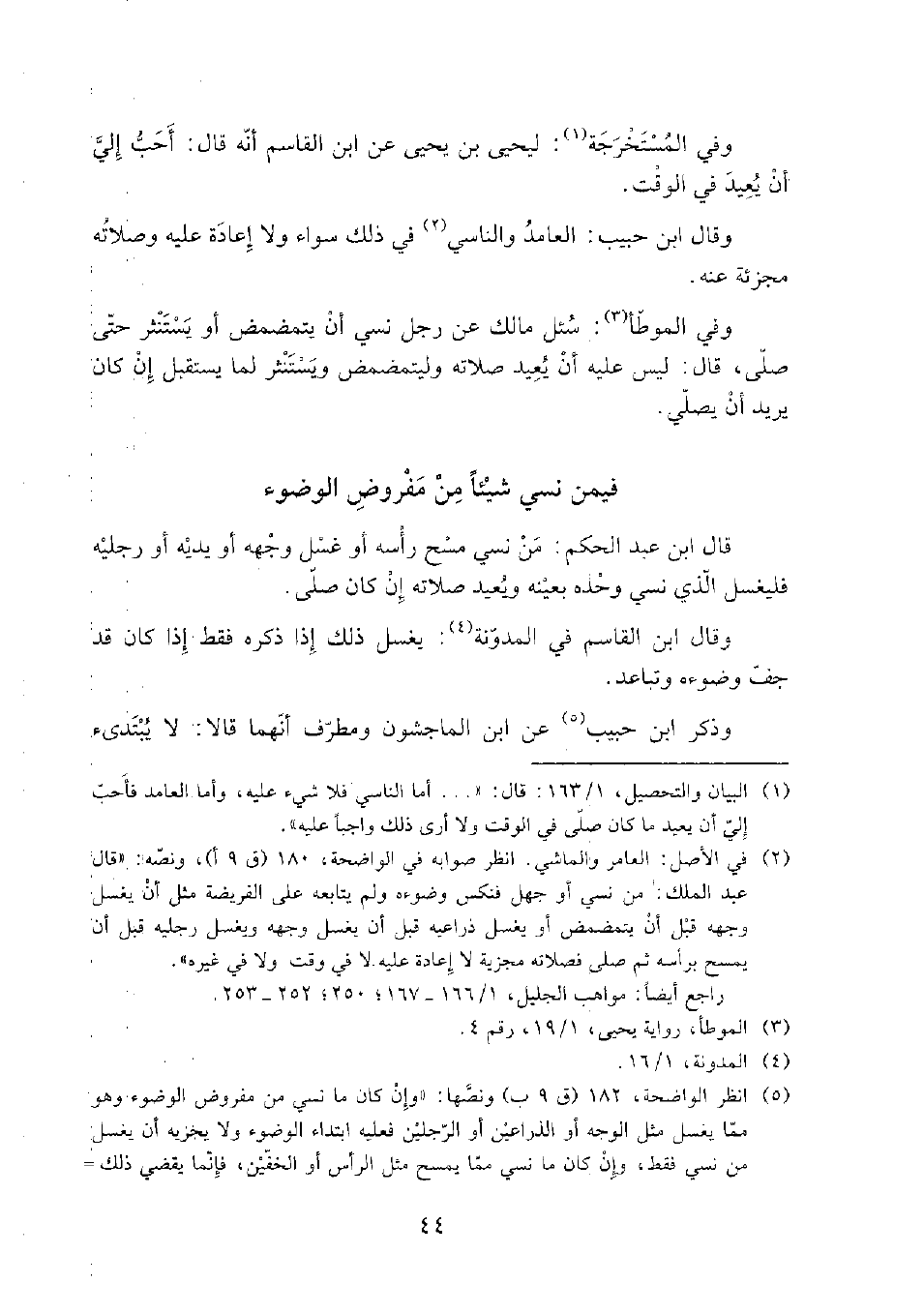 (¬5) انظر الواضحة، 182 (ق 9 ب) ونصها: ((وإن كان ما نسي من مفروض الوضوء وهو مما يغسل مثل الوجه أو الذراعين أو الرجلين فعليه ابتداء الوضوء ولا يجزيه أن يغسل من نسي فقط، وإن كان ما نسي مما يمسح مثل الرأس أو الخفين، فإنما يقضي ذلك =