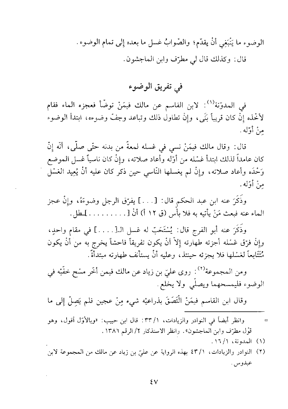 وذكر عنه ابن عبد الحكم قال: [...] يفرق الرجل وضوءه، وإن عجز الماء عنه فبعث من يأتيه به فلا بأس (ق 12 أ) أن [.........]ـطل.
