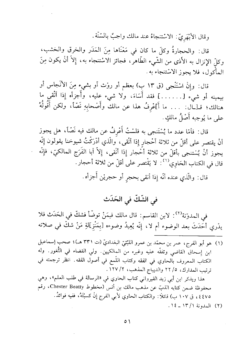 قال: فأما عدد ما يستنجى به فلست أعرف عن مالك فيه نصا، هل يجوز أن يقتصر على أقل من ثلاثة أحجار إذا أنقى، والذي أدركت شيوخنا يقولون إنه يجوز أن يستنجى بأقل من ثلاثة أحجار إذا أنقى، إلا أبا الفرج المالكي، فإنه قال في الكتاب الحاوي (¬1): لا يقتصر على أقل من ثلاثة أحجار. قال: والذي عنده أنه إذا أنقى بحجر أو حجرين أجزأه. في الشك في الحدث في المدونة (¬2): لابن القاسم: قال مالك فيمن توضأ فشك في الحدث فلا يدري أحدث بعد الوضوء أم لا، إنه يعيد وضوءه [بمنز] لة من شك في صلاته