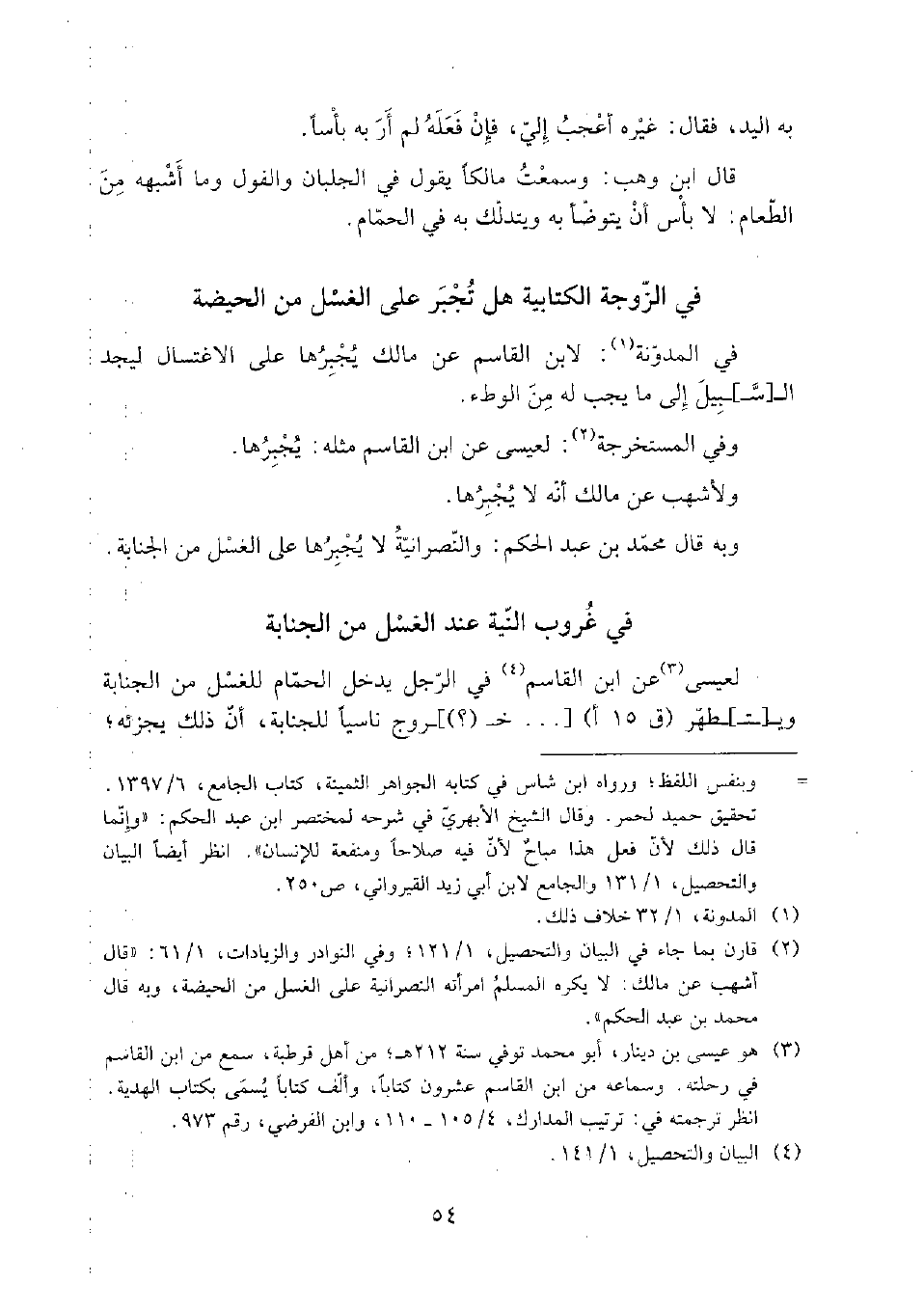 (¬2) قارن بما جاء في البيان والتحصيل، 1/ 121؛ وفي النوادر والزيادات، 1/ 61: ((قال أشهب عن مالك: لا يكره المسلم امرأته النصرانية على الغسل من الحيضة، وبه قال محمد بن عبد الحكم)).