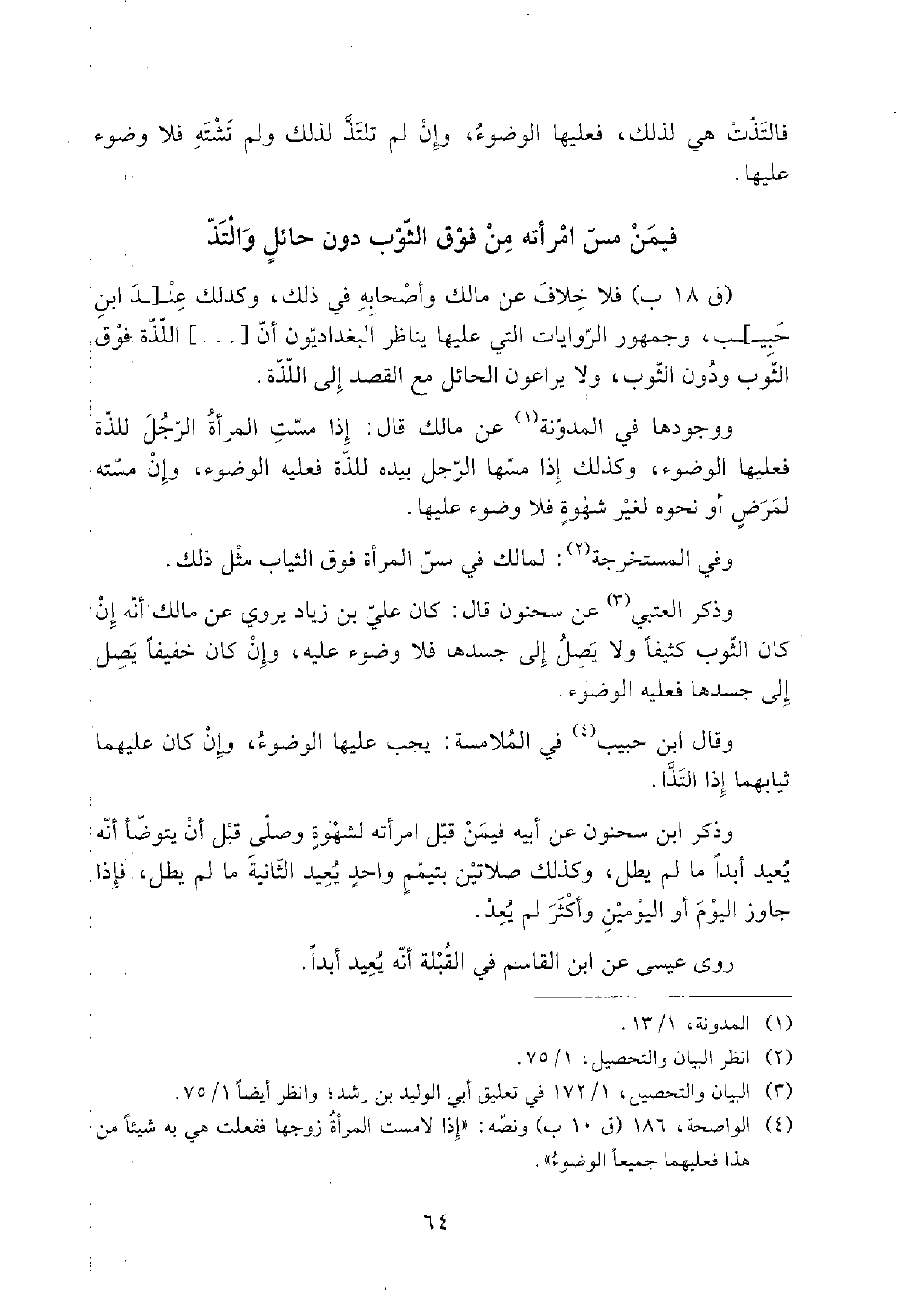 (¬4) الواضحة، 186 (ق 10 ب) ونصه: ((إذا لامست المرأة زوجها ففعلت هي به شيئا من هذا فعليهما جميعا الوضوء)).