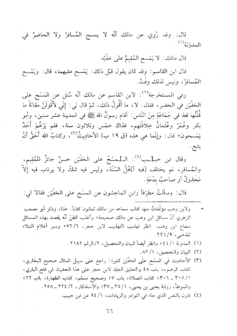 (¬3) الأحاديث في المسح على الخفين كثيرة: راجع على سبيل المثال صحيح البخاري، كتاب الوضوء، باب 48 والتعليق الجيد لابن حجر على هذا الحديث في فتح الباري، 1/ 305 - 306؛ كتاب الصلاة، باب 7؛ وصحيح مسلم، كتاب الطهارة، باب 22؛ والموطأ، رواية يحيى بن يحيى، 1/ 35 - 37؛ والاستذكار، 2/ 224 - 258.